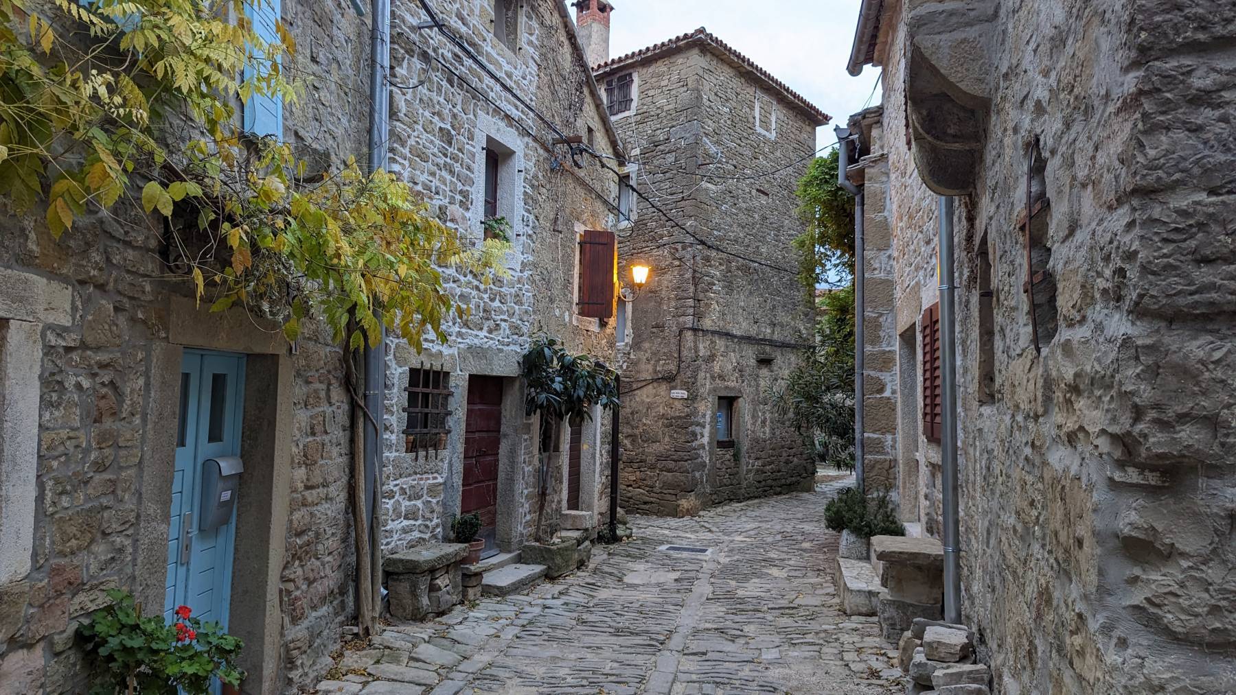 Die Slowenische Küste ist sehr kurz, so sind wir schnell in Kroatien. Groznjan, ist eines von vielen mittelalterlichen Bergdörfern, die Mitte des 20. Jahrhunderts verlassen worden sind. Hier haben sich Künstler niedergelassen und haben den Ort sehr schön renoviert. Gut, jetzt im Winter ist er wieder sehr verlassen, aber schön anzusehen. Hier bleiben wir auch auf einem im Winter kostenlosen Parkplatz.