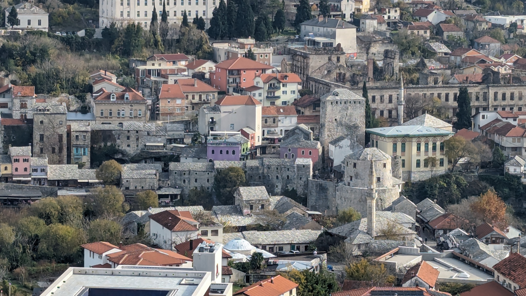 In Mostar wollen wir auf jeden Fall auf einen bewachten Parkplatz, nach allem was wir gelesen haben. Nach einiger Kurverei durch die Stadt mit völlig ungeeigneten oder/und auch zu teuren Plätzen (€ 30,–) können wir am über 100m hohen Campanile für € 10,– die Nacht auf einem großen Busparkplatz stehen bleiben. Nach einer ruhigen Nacht, werden wir um 7 Uhr von lautem Geläute geweckt, was Wunder, wenn man unter einem bedeutenden Glockenturm steht. Die Nacht brachte uns wieder Minusgrade und tagsüber werden es auch nur so um die 8 Grad. Also wieder zurück an die Küste nach Kroatien.