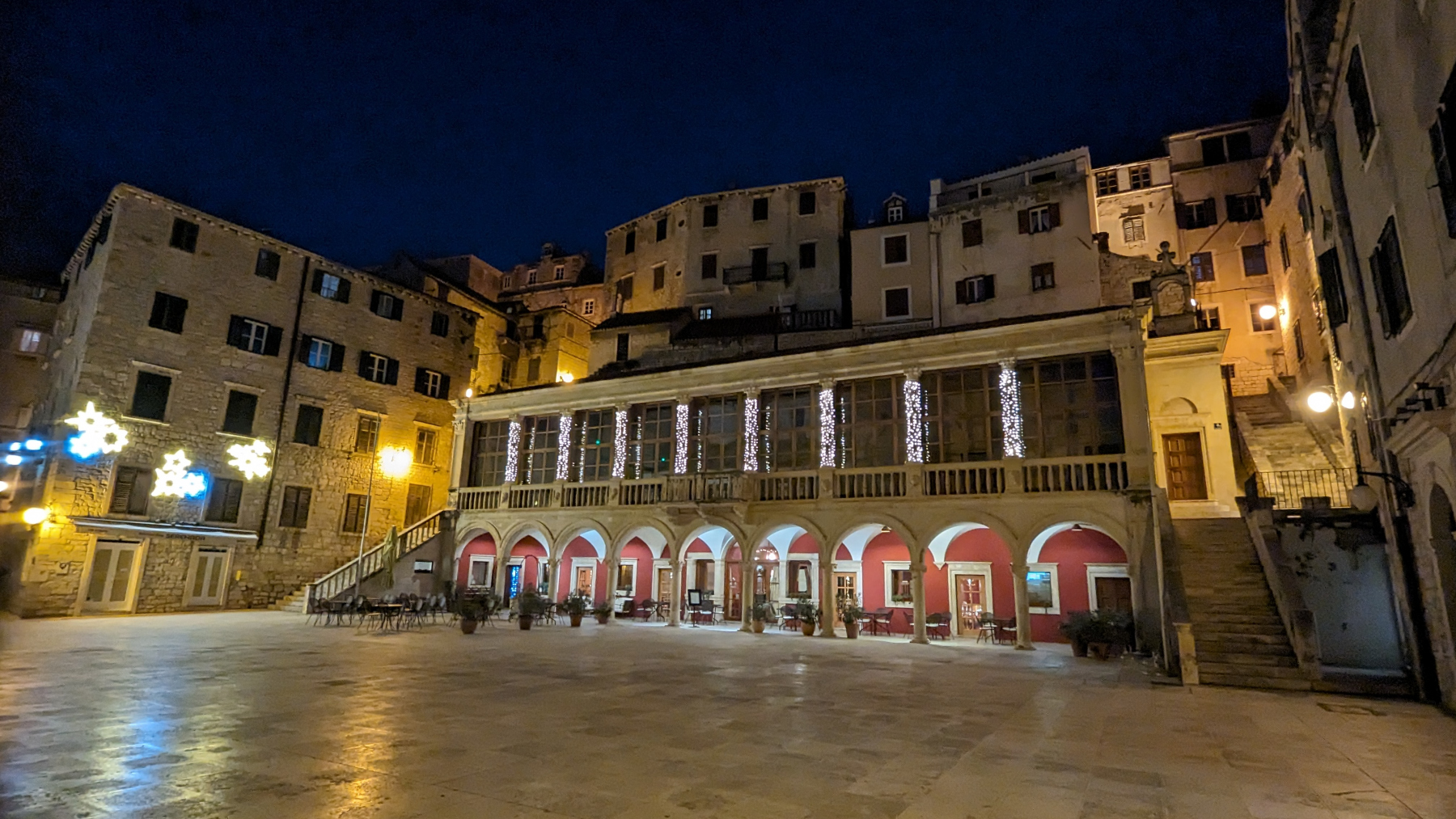 Ein 360GradRundblick in der Altstadt von Sibenik mit City-Halle und der Kathedrale des hl. Jakob