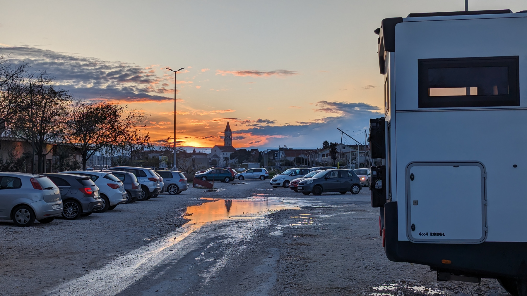 In Kroatien ist das Freistehen grundsätzlich verboten. Wenn es erlaubt ist irgendwo auch über Nacht zu stehen, werden sehr häufig Mondpreise aufgerufen. Das bedeutet gleichzeitig, dass es mit dem Entsorgen oder Wasser tanken auch schwierig ist. Auf Campingplätzen ist dies natürlich in der Regel möglich. Diese sind aber zu der jetzigen Jahreszeit, wenn nicht zu teuer, auch häufig einfach zu. Andersherum gibt es aber auch unzählige Motor-Camps entlang der Küste. Viele Privatleute bieten ihren Garten oder Hof als Parkfläche an. Wir suchen uns einen Platz heraus, für den der letzte im November Euro 12,– gezahlt hatte, alleine unterwegs. Bei uns wirft die ältere Dame pro Person € 9,- in den Raum. Wir werden belehrt, hier wird überall nur die Person berechnet und die anderen würden alle mindestens € 10,– nehmen.  Wir bleiben natürlich, ist ja schon dunkel und die Dame reinigt zuerst den sanitären Bereich nochmal. Unser Hinweis, brauchen wir nicht, kontert sie: „Die sollen wir gefälligst nutzen, dafür wären sie nur mal da“ Punkt. Wir duschen nach über 2 Jahren wieder auf festem Boden unter den Füßen.