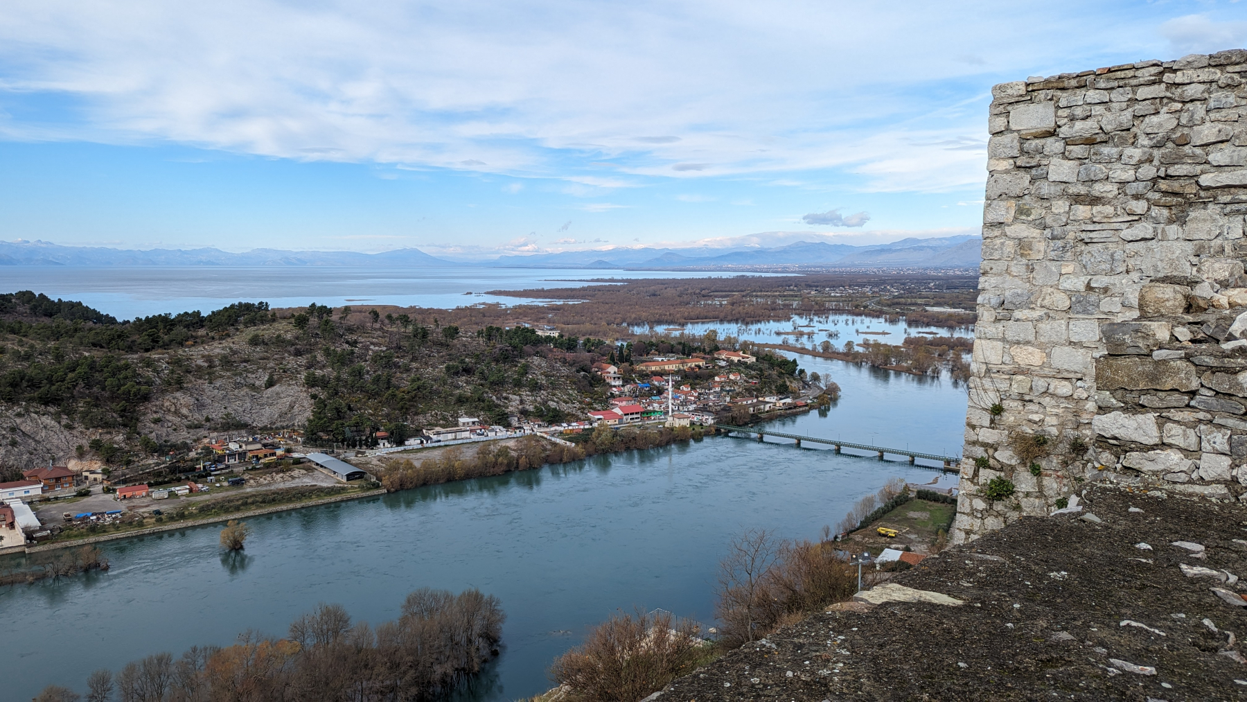 Nach Albanien, genauer Shkodra unserem ersten Zielort, sind es nur 174 km. Wir brauchen mit 2 Grenzen und einer kurzen Fährüberfahrt 6 ½ Stunden. Eine sehr mühsame, kurvenreiche Strecke mit viel schlechter Straße. Nett: Beide montenegrinischen Zöllner sprechen Deutsch mit uns, sie lernen es in der Schule.