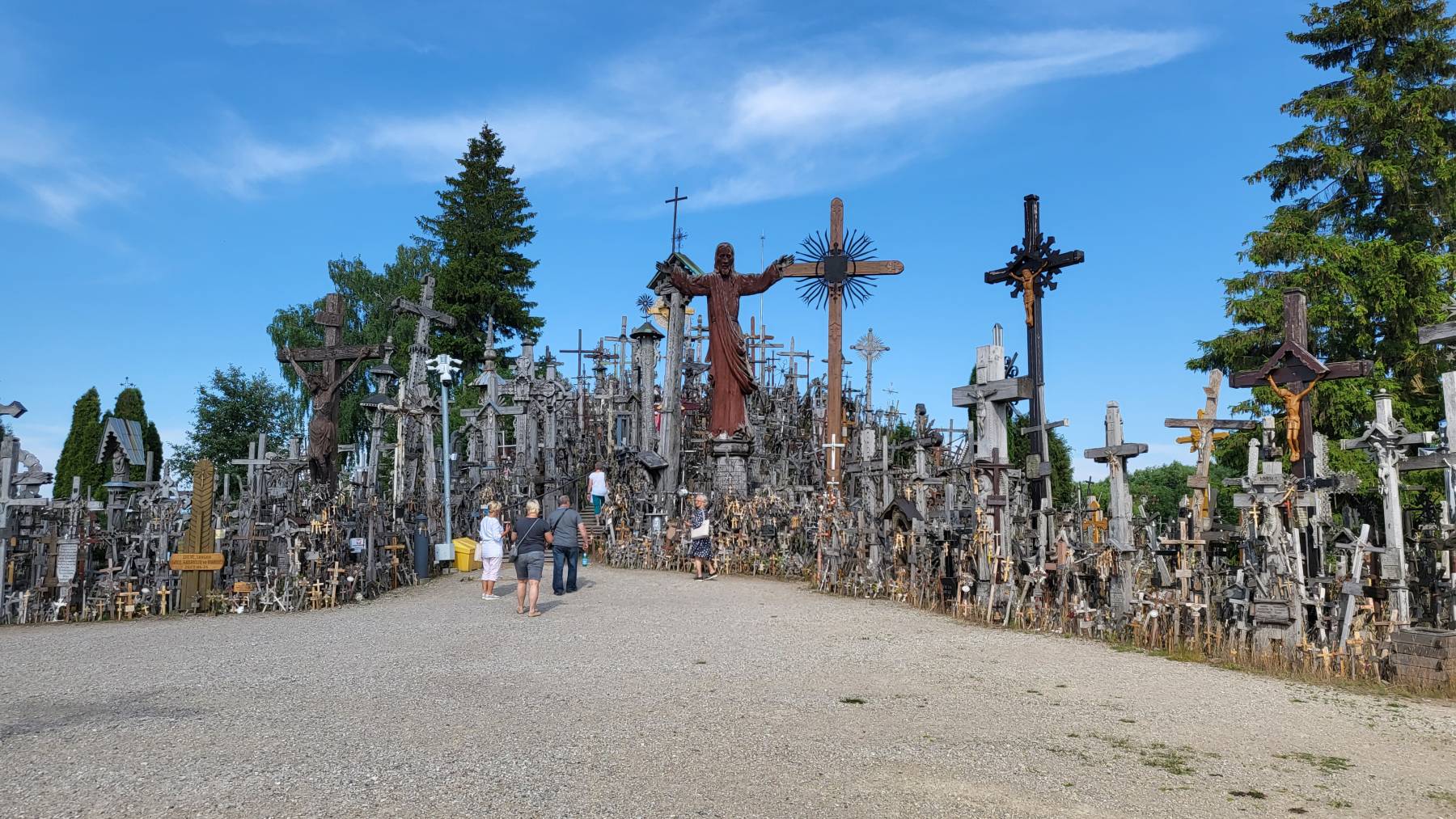 Der Ort ist aber wohl eher bekannt für eine ungewöhnliche Attraktion, dem Berg der Kreuze. Der Ort war in vorchristlicher Zeit bereits ein heiliger Ort. Während der Aufstände gegen die russischen Besatzung im 19. Jahrhundert stellte man Kreuze für gefallene Angehörige auf, um 1900 sollen es 400 gewesen sein. Nach der stalinistischen Zeit 1953 kehrten viele Litauer aus den sibirischen Lagern zurück und stellten Kreuze für verstorbene Kameraden auf. Den kommunistischen Besatzern war dies aber ein Dorn im Auge und 1961 wurde alles mit Bulldozern dem Erdboden gleich gemacht. Schon in der folgenden Nacht standen dort wieder Kreuze. Das wiederholte sich noch in den siebzigern ein paar Mal. Der Berg ist aber immer weiter gewachsen und mittlerweile ein heiliger Ort für Katholiken, auch der Papst hielt dort eine Messe ab. Es werden laufend aus den verschiedensten Anlässen Kreuze dort aufgestellt bzw. angehängt.