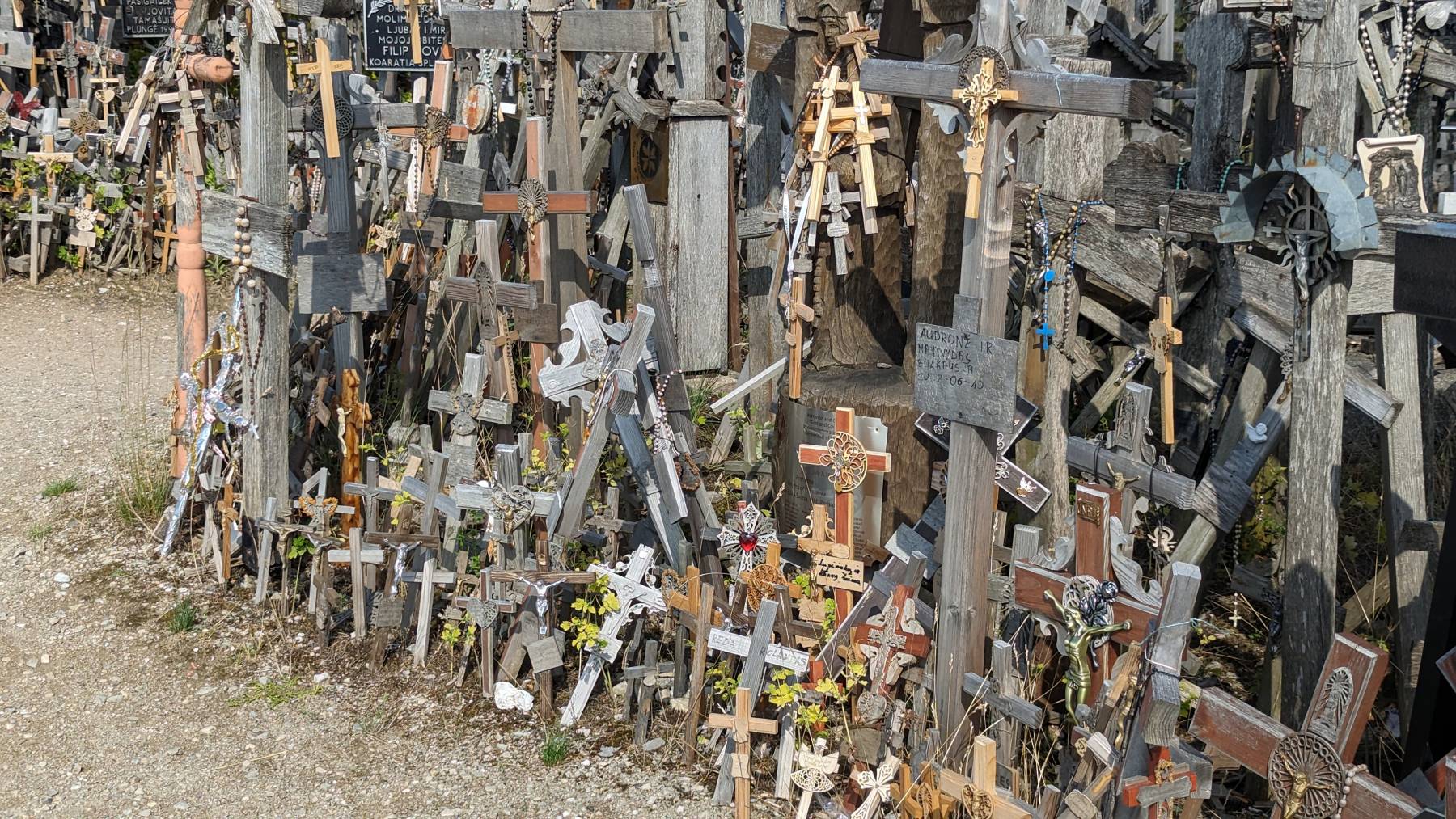 Der Ort ist aber wohl eher bekannt für eine ungewöhnliche Attraktion, dem Berg der Kreuze. Der Ort war in vorchristlicher Zeit bereits ein heiliger Ort. Während der Aufstände gegen die russischen Besatzung im 19. Jahrhundert stellte man Kreuze für gefallene Angehörige auf, um 1900 sollen es 400 gewesen sein. Nach der stalinistischen Zeit 1953 kehrten viele Litauer aus den sibirischen Lagern zurück und stellten Kreuze für verstorbene Kameraden auf. Den kommunistischen Besatzern war dies aber ein Dorn im Auge und 1961 wurde alles mit Bulldozern dem Erdboden gleich gemacht. Schon in der folgenden Nacht standen dort wieder Kreuze. Das wiederholte sich noch in den siebzigern ein paar Mal. Der Berg ist aber immer weiter gewachsen und mittlerweile ein heiliger Ort für Katholiken, auch der Papst hielt dort eine Messe ab. Es werden laufend aus den verschiedensten Anlässen Kreuze dort aufgestellt bzw. angehängt.