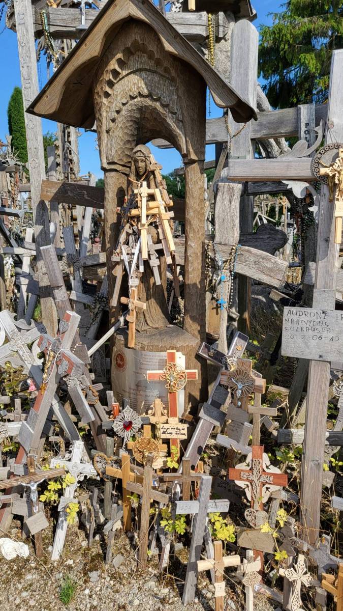 Der Ort ist aber wohl eher bekannt für eine ungewöhnliche Attraktion, dem Berg der Kreuze. Der Ort war in vorchristlicher Zeit bereits ein heiliger Ort. Während der Aufstände gegen die russischen Besatzung im 19. Jahrhundert stellte man Kreuze für gefallene Angehörige auf, um 1900 sollen es 400 gewesen sein. Nach der stalinistischen Zeit 1953 kehrten viele Litauer aus den sibirischen Lagern zurück und stellten Kreuze für verstorbene Kameraden auf. Den kommunistischen Besatzern war dies aber ein Dorn im Auge und 1961 wurde alles mit Bulldozern dem Erdboden gleich gemacht. Schon in der folgenden Nacht standen dort wieder Kreuze. Das wiederholte sich noch in den siebzigern ein paar Mal. Der Berg ist aber immer weiter gewachsen und mittlerweile ein heiliger Ort für Katholiken, auch der Papst hielt dort eine Messe ab. Es werden laufend aus den verschiedensten Anlässen Kreuze dort aufgestellt bzw. angehängt.