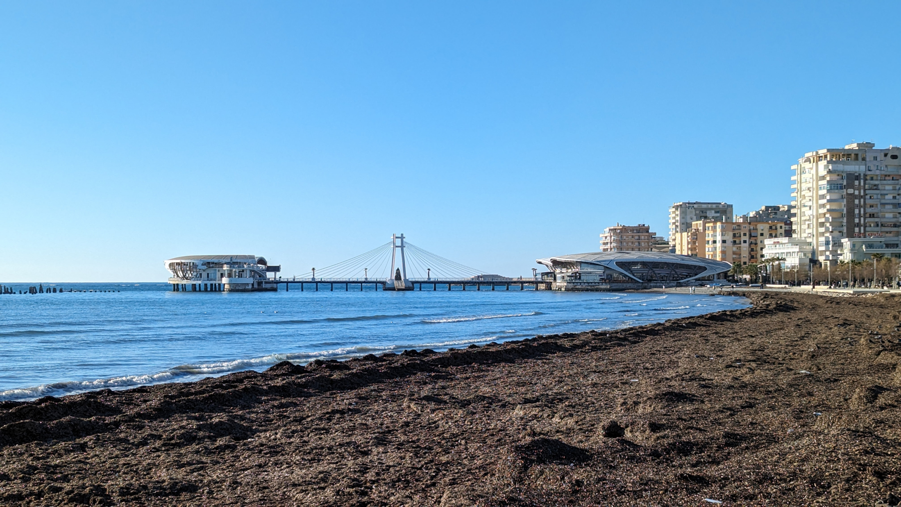 Die Hauptstadt Tirana wollen wir auslassen. Die Stadt soll verkehrsmäßig chaotisch sein und interessiert uns nicht wirklich. Campingplätze oder ähnliches gibt es nur außerhalb. In die Stadt müssten wir 40 Minuten mit dem Bus, bei aufkommender Erkrankungswelle hätten wir dazu auch keine Lust. Dafür fahren wir an die Küste, nach Durres, soll schön sein und lockt mit einem römischen Amphitheater. Wir finden zentrumsnah einen Parkplatz, spazieren auf dem neu angelegten breiten Boulevard, gehen zum Theater und zum venezianischen Turm und zurück zum Parkplatz. Einen richtig netten Eindruck gewinnen wir nicht. Viele ruinöse Bauten und Müll und Industriehafen bleiben eher hängen.