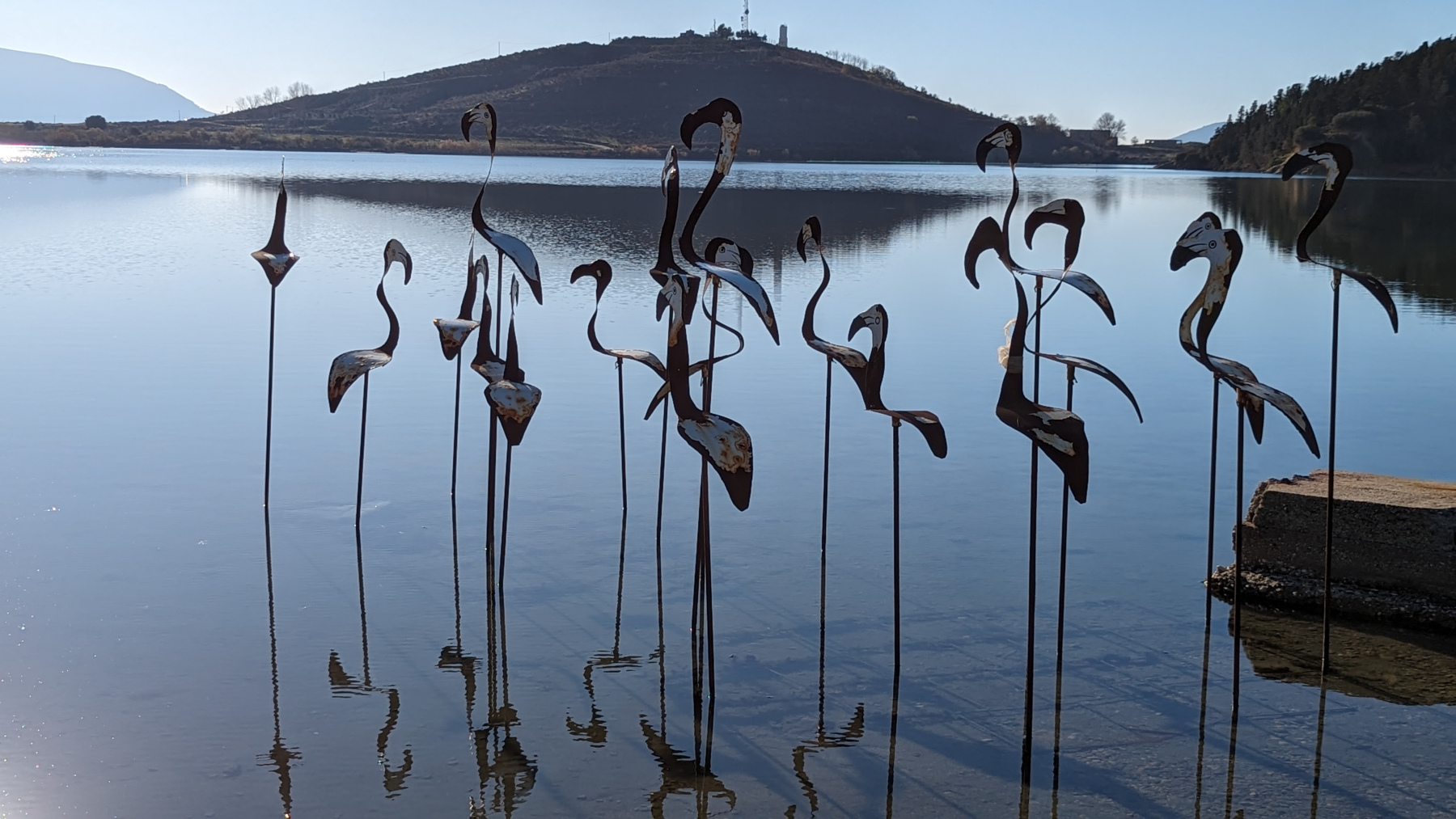 Nur wenige Kilometer südlich finden wir die Lagune von Patok reizvoll. Durch die Lagune führt ein schmaler Damm auf dem viele Fischlokale den Fisch aus der Lagune anbieten. Der Weg dahin gestaltet sich aber schwierig. Es fällt uns schon die ganzen Tage in Albanien auf, dass die Stromleitungen oder was es immer ist, sehr niedrig hängen. Wir müssen häufig die durchhängenden Kabel konzentriert unterfahren. Heute hängt ein Kabel soweit durch, dass nur noch PKW darunter herfahren können. Wir werden nett vorzeitig auf den Missstand vom entgegenkommenden Verkehr darauf hingewiesen, finden aber auf Umwegen doch zur Lagune.