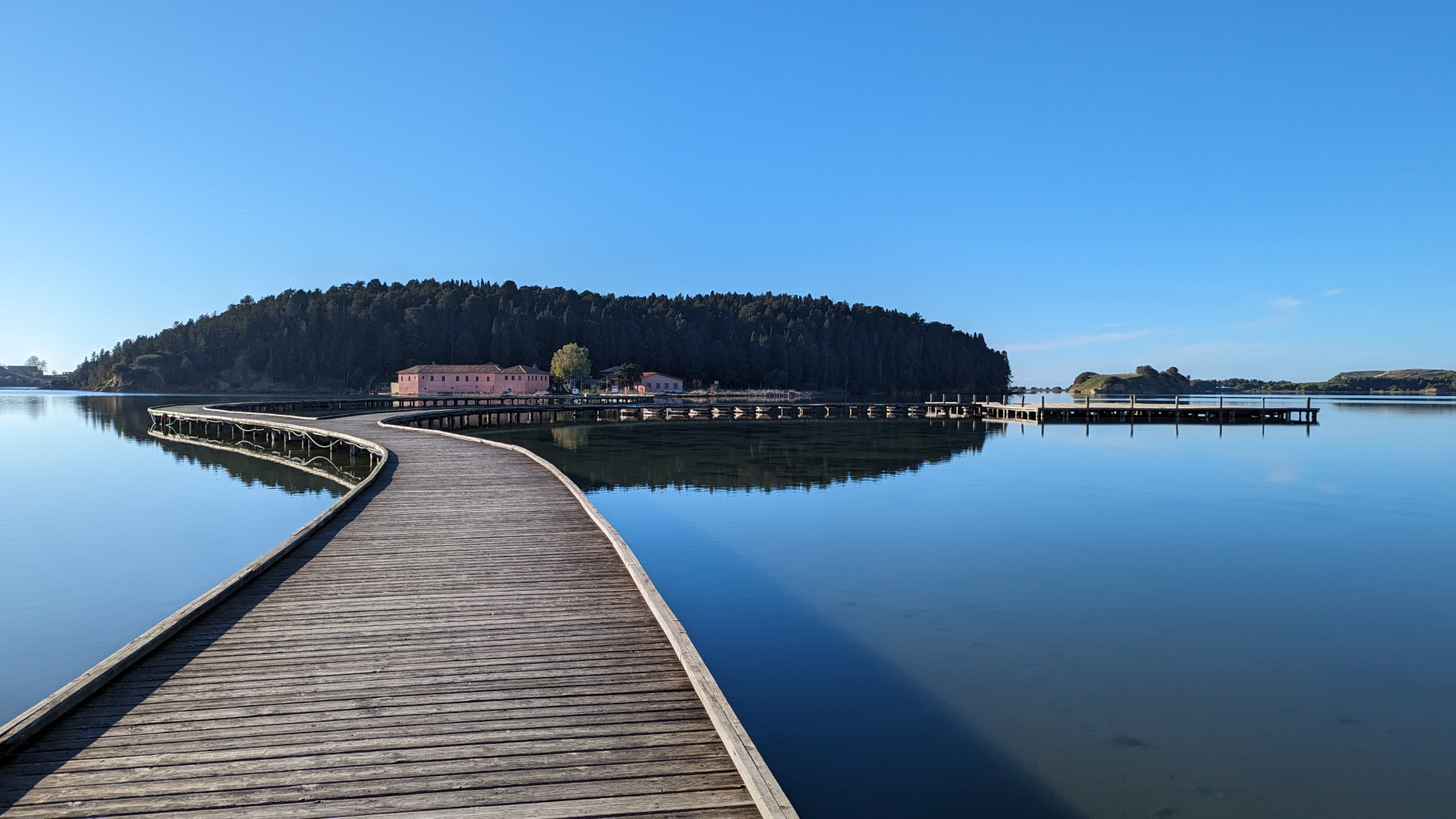 Nur wenige Kilometer südlich finden wir die Lagune von Patok reizvoll. Durch die Lagune führt ein schmaler Damm auf dem viele Fischlokale den Fisch aus der Lagune anbieten. Der Weg dahin gestaltet sich aber schwierig. Es fällt uns schon die ganzen Tage in Albanien auf, dass die Stromleitungen oder was es immer ist, sehr niedrig hängen. Wir müssen häufig die durchhängenden Kabel konzentriert unterfahren. Heute hängt ein Kabel soweit durch, dass nur noch PKW darunter herfahren können. Wir werden nett vorzeitig auf den Missstand vom entgegenkommenden Verkehr darauf hingewiesen, finden aber auf Umwegen doch zur Lagune.