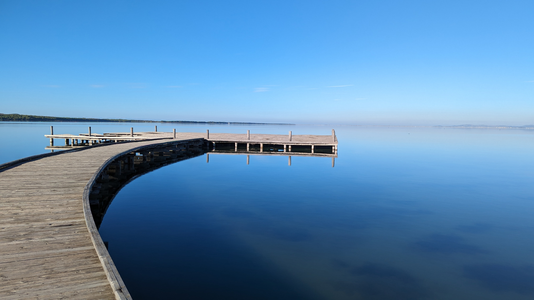 Nur wenige Kilometer südlich finden wir die Lagune von Patok reizvoll. Durch die Lagune führt ein schmaler Damm auf dem viele Fischlokale den Fisch aus der Lagune anbieten. Der Weg dahin gestaltet sich aber schwierig. Es fällt uns schon die ganzen Tage in Albanien auf, dass die Stromleitungen oder was es immer ist, sehr niedrig hängen. Wir müssen häufig die durchhängenden Kabel konzentriert unterfahren. Heute hängt ein Kabel soweit durch, dass nur noch PKW darunter herfahren können. Wir werden nett vorzeitig auf den Missstand vom entgegenkommenden Verkehr darauf hingewiesen, finden aber auf Umwegen doch zur Lagune.