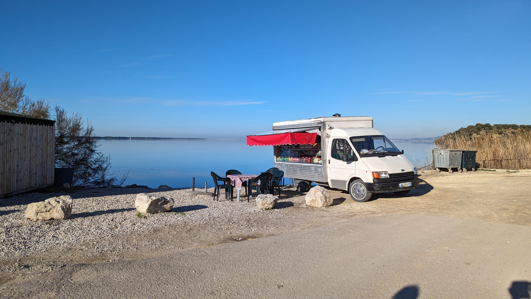 Nach so viel Kultur geht es wieder an die Küste. Die Lagune von Nartes, bei Vlora, ist sehr beliebt bei dem stark zugenommenen Wohnmobiltourismus. Weite Sandstrände mit klarstem Wasser und unzähligen Stellplatzmöglichkeiten tauchen in allen YouTube-Videos der Albanienreisenden auf. Als wir ankommen, nach 2 km übelster offroad-Strecke, sind wir aber wieder mal die Einzigen. Warum sich in unserer letzten Nacht ein polnischer Vanlifer mit seinem VW Bully genau auf dem sehr kleinen Teilstück zwischen uns und dem Abhang stellt, wird uns ein ewiges Rätsel bleiben.