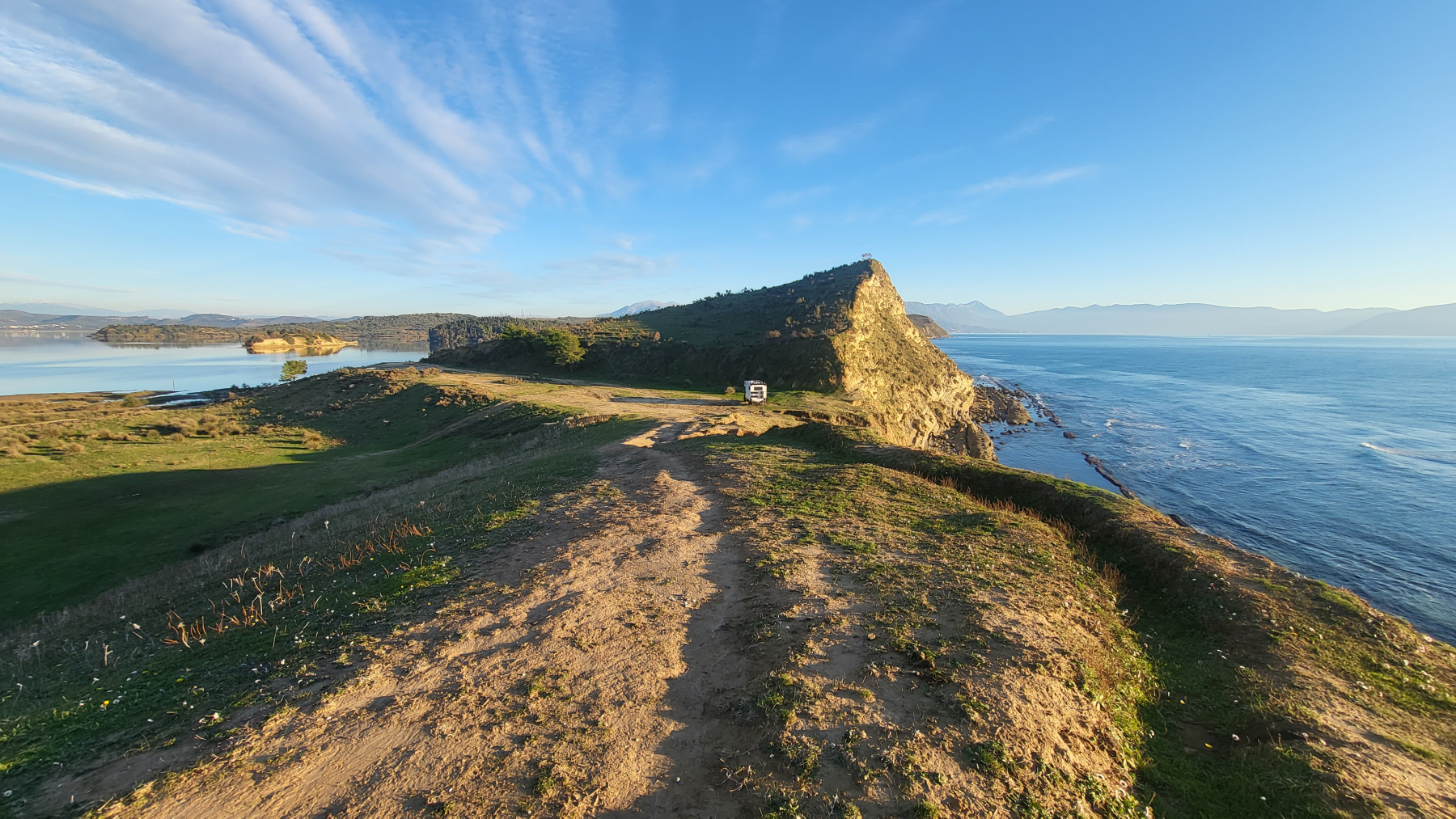 Zwei 360Grad Rundblicke vom Traum-Stellplatz bei Vlora – aus 120m und von unten (Wechsel über Pfeile)