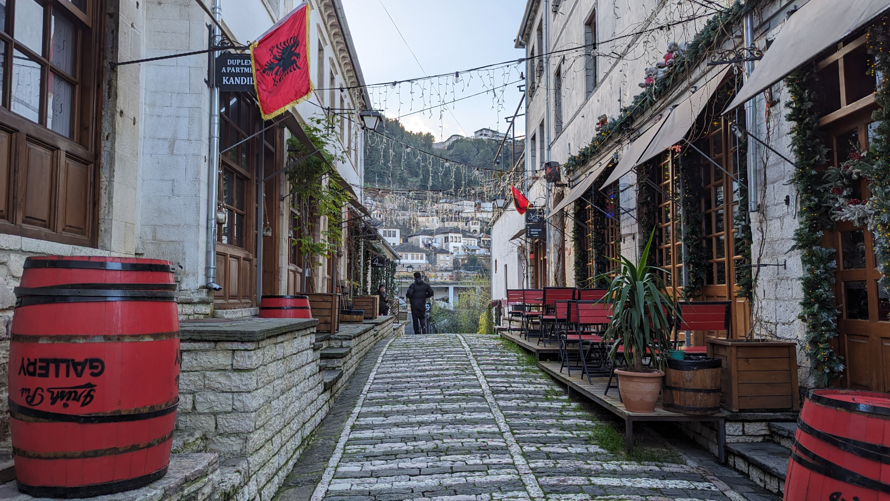An sich wollten wir Weihnachten schon in Griechenland sein. Wir fühlen uns in Albanien aber wohl und wollen uns noch zwei Sachen angucken: Das „Blue Eye“ und eine weitere Stadt, welche auf der UNESCO-Liste steht, Gjirokaster. Beides absolut sehenswert. Die Altstadt von Gjirokaster gefällt uns von allen besuchten Ortschaften dann auch am besten und wirkt sehr lebendig, wenn es auch am touristischsten ist.