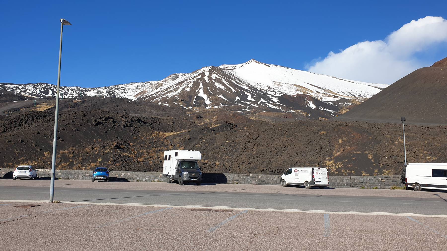 Natürlich bleiben wir nicht dort, besonders nach den Erdbeben vor ein paar Tagen nördlich von Sizilien. Wir wollen an sich auf den Ätna. Das ist im Winter zeitlich nicht immer alles unter einen Hut zu bringen: Um 16.30 Uhr ist es dunkel. Damit wir die interessante Auffahrt durch erkaltete Lavaströme auch optisch mitnehmen können, finden wir einen Platz unweit eines Lidl (nicht auf dem Lidl Platz selbst!). Nach hinten raus Blick auf den Ätna mit neuem Lavastrom und vorne frische Brötchen und Croissants – auch die sind klasse, wenn es keine anderen gibt – welch schönes Zuhause.