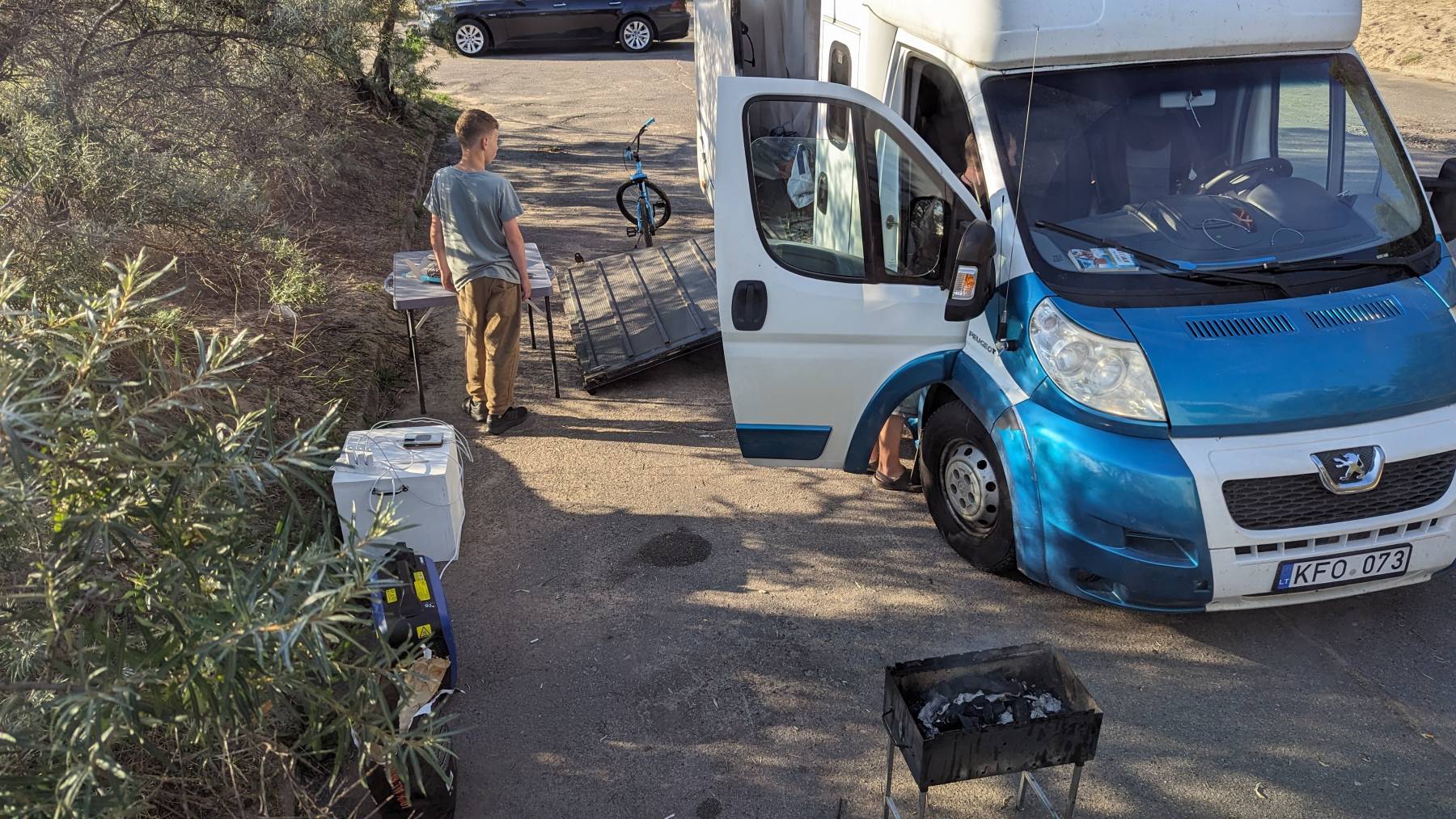Lettland müssen wir sowieso von unserem schönen Stellplatz direkt am Meer verlassen. Abends kommt ein altes litauisches Wohnmobil, stellt sich auf dem großen freien Platz direkt quer zu uns, praktisch in unserem Windschatten, klappt eine große Tür an der Seite raus, baut Tisch und Stühle auf, befeuert unmittelbar einen Holzkohlegrill unter unserem Wohnzimmerfenster und startet einen Generator. In einem „festen Zuhause“ würde man ihn wohl direkt verklagen. Wir können halt einfach den Platz wechseln, ärgerlich weil wir da schon 2 Tage stehen. Wir fahren also 100m weiter.