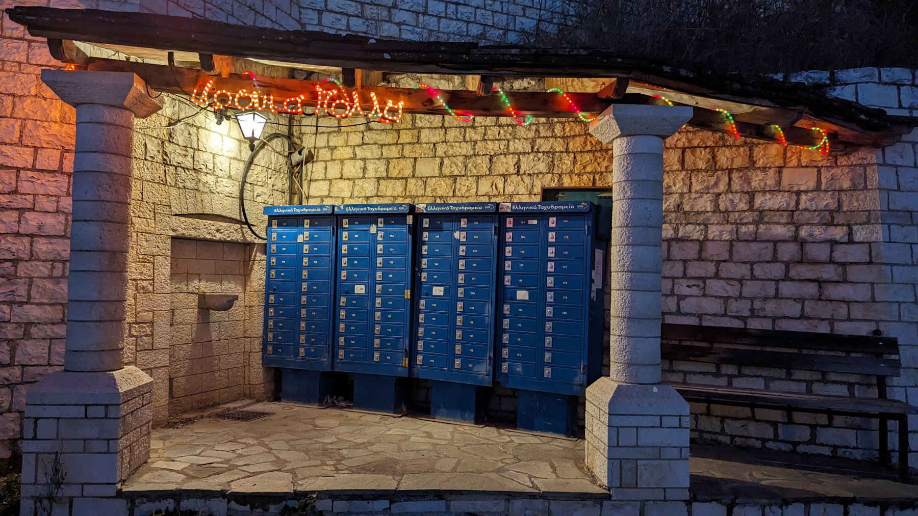 Am zweiten Weihnachtsfeiertag Wäsche waschen ist ein guter Plan, finden wir. Mitten in Ioannina soll es beim Selbstbedienungswaschsalon keinen Parkplatz geben. Der Laden ist offen und wir parken direkt gegenüber, ist halt Feiertag. Wir kommen mit einem jungen Pärchen ins Gespräch. Ins Gespräch ist gut. Englisch geht, aber wir nutzen schnell Google-Übersetzer und sehen zum ersten Mal auf deren Handy die griechischen Buchstaben – witzig. Die beiden studieren – Dimitrios Informatik, Tzeni Grundschullehrerin, – und erzählen was sie im kommenden Jahr beim Berufsstart in Griechenland verdienen werden: Er € 1.500,– Sie € 900,–. Für ein möbliertes 48qm großes Apartment zahlen sie € 300,–. Der Waschsalon wird voller und „älter“ und es geht um die Rente. Sie müssen genauso lange arbeiten wie bei uns, aber es wird mehr abgezogen, wenn man früher geht. Tja, und dann geht Tzeni los und kommt ein paar Minuten wieder mit einer Tüte mit zwei kleinen Kartons und vielen süßen griechischen Spezialitäten aus der Konditorei – ein Geschenk. Wir können uns nur mit einer Dose Früh-Kölsch (wurde direkt verköstigt) und einer regionalen Süßigkeit aus dem Rheinland (Haribo) revanchieren.