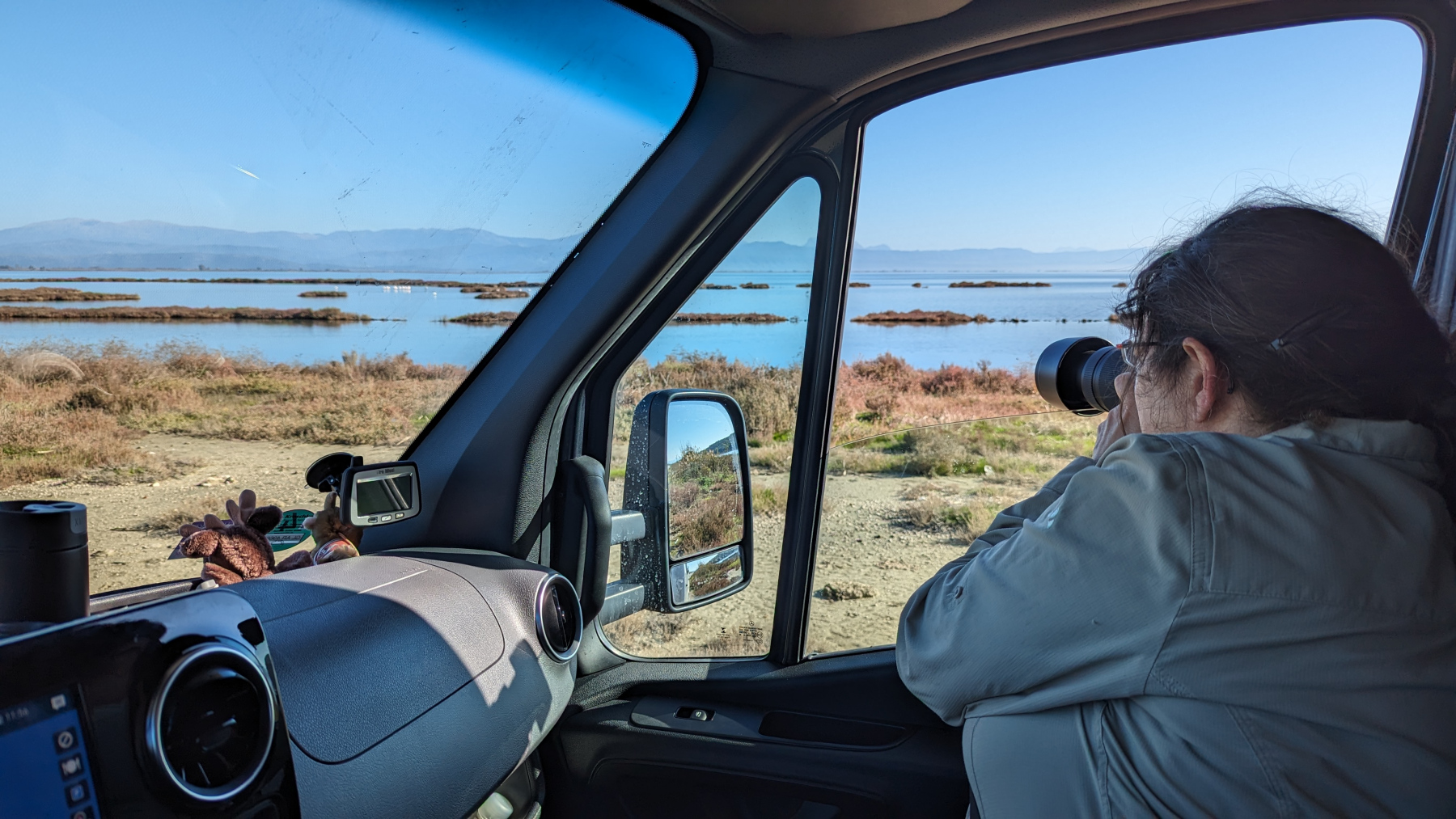 Nach einer ruhigen Übernachtung oberhalb des Sees von Ioannina wollen wir zum Ambrakischen Golf. Vielleicht sehen wir noch ein paar Flamingos. Wir filmen – verbotenerweise – unsere Fahrt über den Damm durch den Golf. Am Ende ist ein ausgewiesener Parkplatz, auf dem sogar Camping erlaubt ist. Wir bleiben, allerdings nur bis 19 Uhr. Ein lauter Knall an unserem Heck schreckt uns auf. Anette reißt sofort das Fenster auf und ruft in die Dunkelheit „What´s your problem?“. Wir sehen hinten ein paar Jugendliche Schatten weglaufen. Umgezogen gehen wir ein paar Hundert Meter mit Taschenlampe Richtung Ortschaft und treffen niemanden an. Am Fahrzeug zurück suchen wir mit Taschenlampe nach Schäden oder nach Wurfgeschossen. Wir finden nichts. Was tun? Bleiben und immer wieder achtsam sein? Oder einfach fahren und weiter abseits des Ortes einen anderen Platz anfahren. Zu letzterem entscheiden wir uns. Am nächsten Morgen sehen wir dann einen Handabdruck auf der Heckscheibe. Es ist also jemand hochgesprungen und hat gegen die Scheibe geschlagen. „Modernes Klingelmäuschen“ oder einfach ein Vertreiben wollen? Wir werden es nicht erfahren, lesen aber in den Park4night Bewertungen, dass viele Camper an der Küste in dieser Region dieses Jahr mit Früchten oder ähnlichen beworfen worden sind.