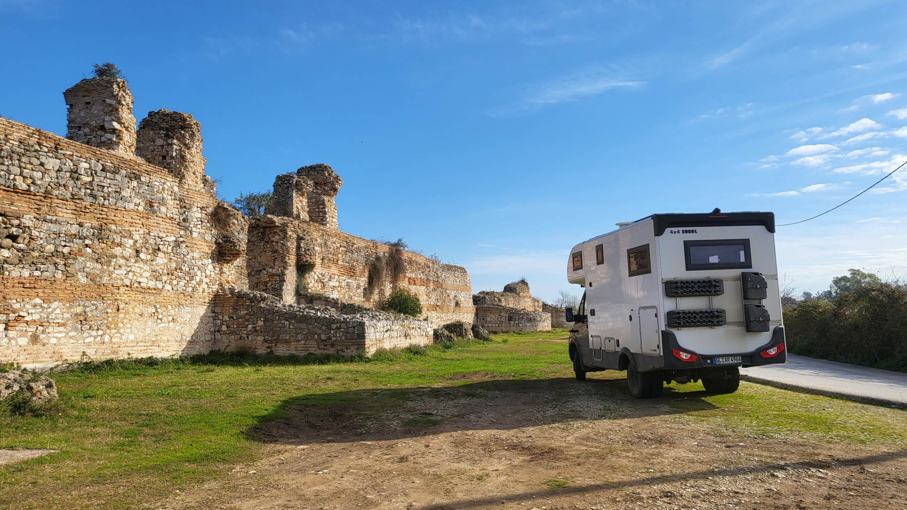 Nach einer ruhigen Nacht am Meer sehen wir, dass es in der Nähe noch eine uns unbekannte antike römische Stätte liegt – Nikopolis. 31 v.Chr. von Kaiser Augustus gegründet. Auf dem sehr weitläufigen Gelände, welches nur mit dem Fahrzeug zu besuchen ist, verteilen sich u.a. zwei Theater, eine lange Stadtmauer und auch Mosaike. Wir bezahlen € 4,–/p.P. Eintritt und sind insgesamt ganz angetan, stehen aber plötzlich vor dem kleinen renovierten Odeon (Theater), welches verschlossen ist. Das geht ja gar nicht 🙈. Zurück zum Auto und zumindest mal mit Drohne gucken. Nicht nur, dass es – wie gesagt – speziell über Ausgrabungen – strengstens verboten ist. Wir haben auch gelesen, dass in Griechenland Greifvögel auf Drohnen abgerichtet werden. Was schließen wir daraus: Bilder und Videos der Drohne täglich sichern, Rest macht dann die Versicherung…