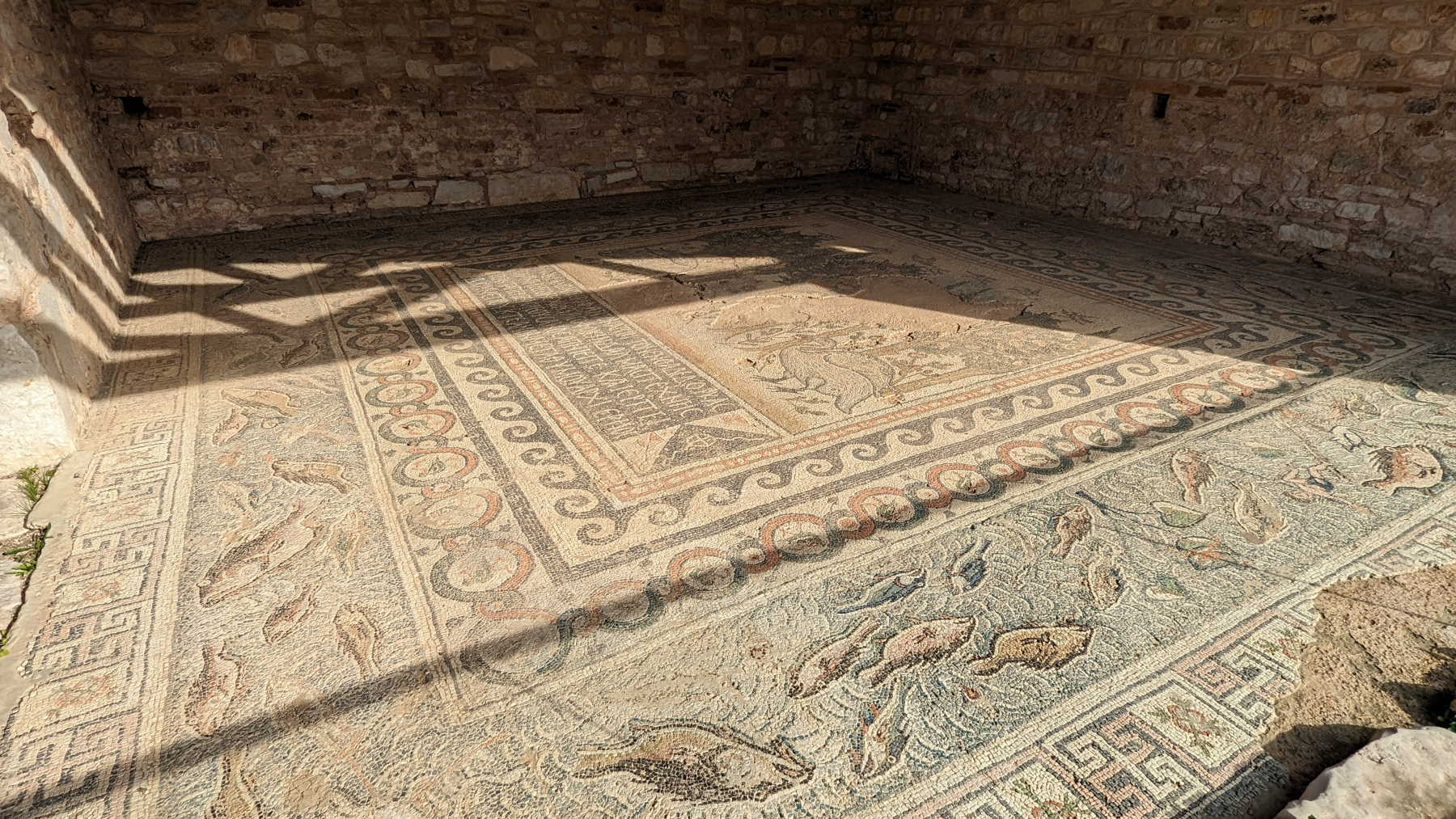 Nach einer ruhigen Nacht am Meer sehen wir, dass es in der Nähe noch eine uns unbekannte antike römische Stätte liegt – Nikopolis. 31 v.Chr. von Kaiser Augustus gegründet. Auf dem sehr weitläufigen Gelände, welches nur mit dem Fahrzeug zu besuchen ist, verteilen sich u.a. zwei Theater, eine lange Stadtmauer und auch Mosaike. Wir bezahlen € 4,–/p.P. Eintritt und sind insgesamt ganz angetan, stehen aber plötzlich vor dem kleinen renovierten Odeon (Theater), welches verschlossen ist. Das geht ja gar nicht 🙈. Zurück zum Auto und zumindest mal mit Drohne gucken. Nicht nur, dass es – wie gesagt – speziell über Ausgrabungen – strengstens verboten ist. Wir haben auch gelesen, dass in Griechenland Greifvögel auf Drohnen abgerichtet werden. Was schließen wir daraus: Bilder und Videos der Drohne täglich sichern, Rest macht dann die Versicherung…