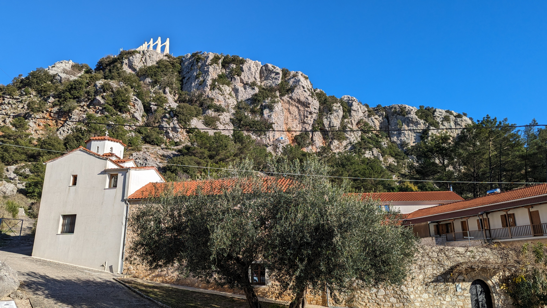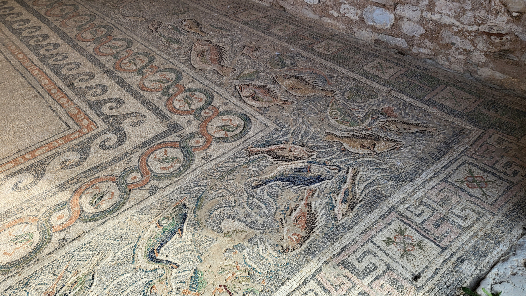 Nach einer ruhigen Nacht am Meer sehen wir, dass es in der Nähe noch eine uns unbekannte antike römische Stätte liegt – Nikopolis. 31 v.Chr. von Kaiser Augustus gegründet. Auf dem sehr weitläufigen Gelände, welches nur mit dem Fahrzeug zu besuchen ist, verteilen sich u.a. zwei Theater, eine lange Stadtmauer und auch Mosaike. Wir bezahlen € 4,–/p.P. Eintritt und sind insgesamt ganz angetan, stehen aber plötzlich vor dem kleinen renovierten Odeon (Theater), welches verschlossen ist. Das geht ja gar nicht 🙈. Zurück zum Auto und zumindest mal mit Drohne gucken. Nicht nur, dass es – wie gesagt – speziell über Ausgrabungen – strengstens verboten ist. Wir haben auch gelesen, dass in Griechenland Greifvögel auf Drohnen abgerichtet werden. Was schließen wir daraus: Bilder und Videos der Drohne täglich sichern, Rest macht dann die Versicherung…