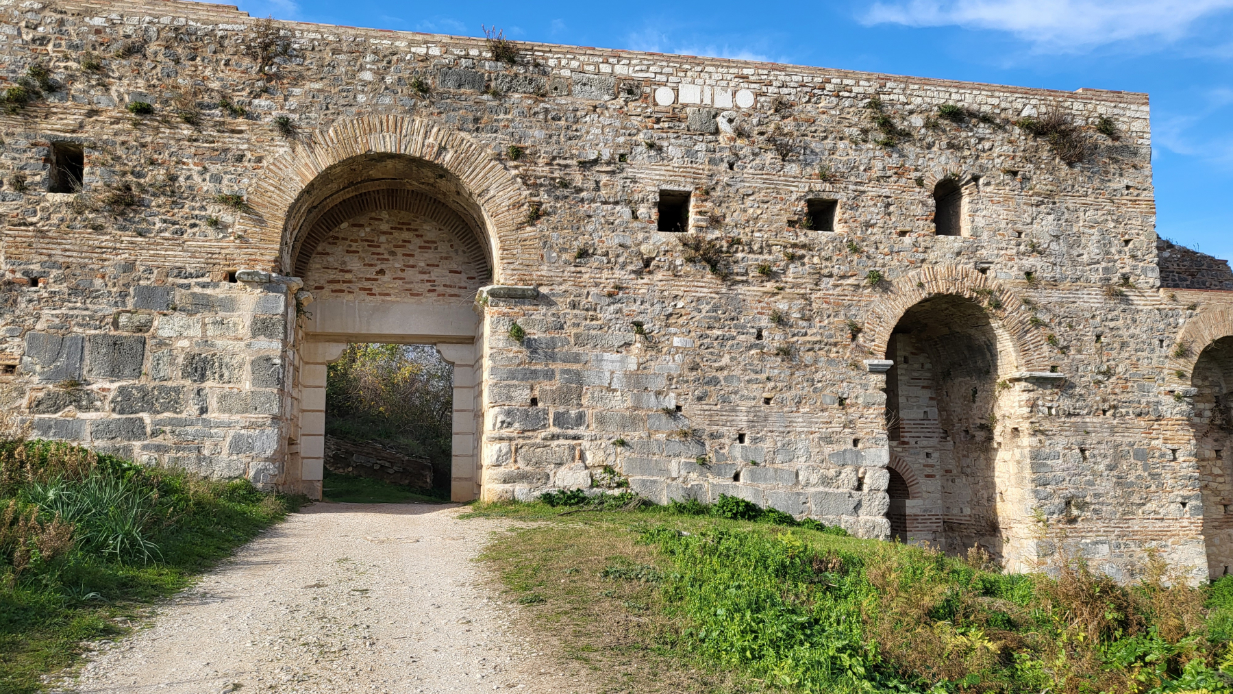Nach einer ruhigen Nacht am Meer sehen wir, dass es in der Nähe noch eine uns unbekannte antike römische Stätte liegt – Nikopolis. 31 v.Chr. von Kaiser Augustus gegründet. Auf dem sehr weitläufigen Gelände, welches nur mit dem Fahrzeug zu besuchen ist, verteilen sich u.a. zwei Theater, eine lange Stadtmauer und auch Mosaike. Wir bezahlen € 4,–/p.P. Eintritt und sind insgesamt ganz angetan, stehen aber plötzlich vor dem kleinen renovierten Odeon (Theater), welches verschlossen ist. Das geht ja gar nicht 🙈. Zurück zum Auto und zumindest mal mit Drohne gucken. Nicht nur, dass es – wie gesagt – speziell über Ausgrabungen – strengstens verboten ist. Wir haben auch gelesen, dass in Griechenland Greifvögel auf Drohnen abgerichtet werden. Was schließen wir daraus: Bilder und Videos der Drohne täglich sichern, Rest macht dann die Versicherung…