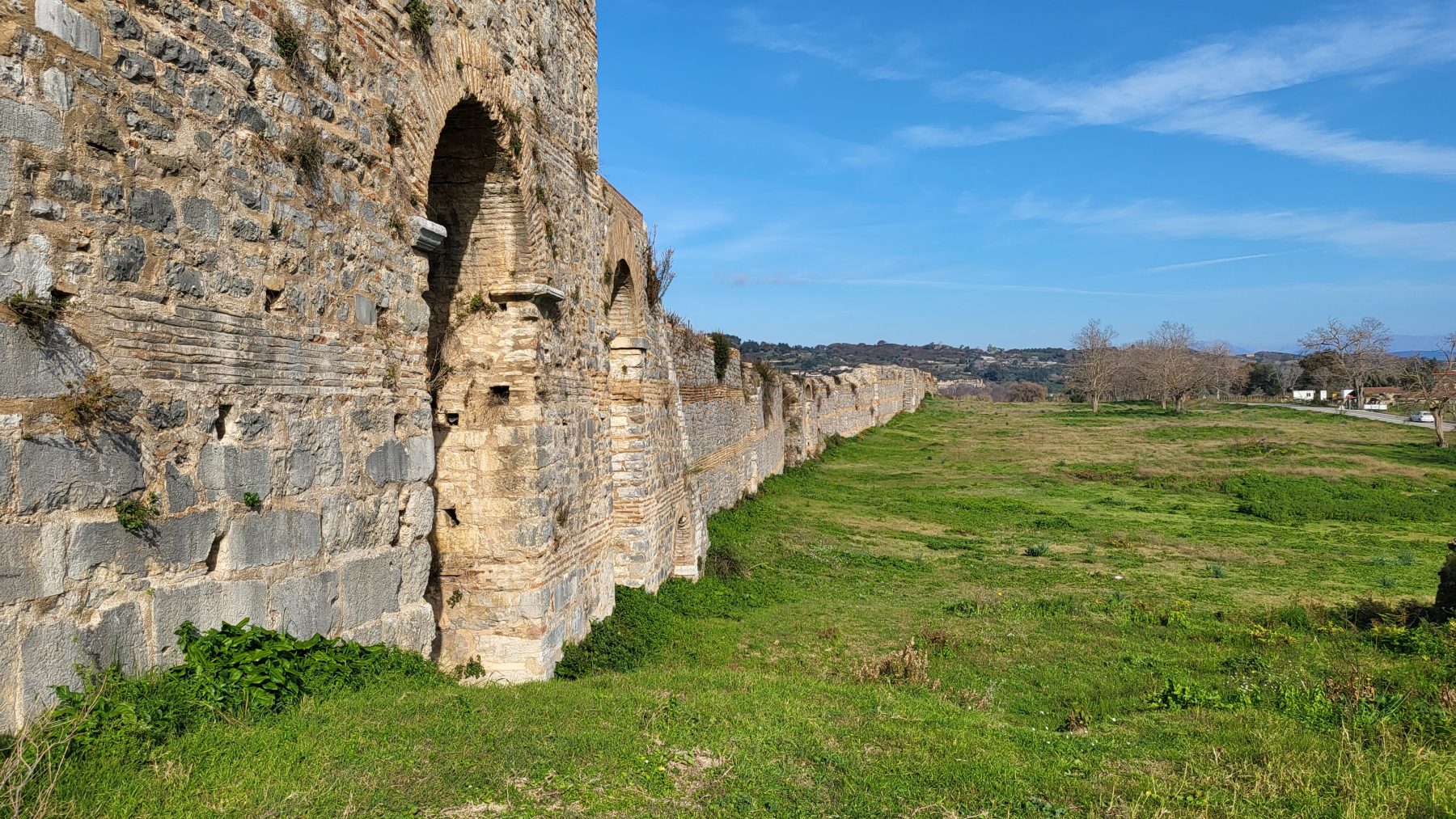 Nach einer ruhigen Nacht am Meer sehen wir, dass es in der Nähe noch eine uns unbekannte antike römische Stätte liegt – Nikopolis. 31 v.Chr. von Kaiser Augustus gegründet. Auf dem sehr weitläufigen Gelände, welches nur mit dem Fahrzeug zu besuchen ist, verteilen sich u.a. zwei Theater, eine lange Stadtmauer und auch Mosaike. Wir bezahlen € 4,–/p.P. Eintritt und sind insgesamt ganz angetan, stehen aber plötzlich vor dem kleinen renovierten Odeon (Theater), welches verschlossen ist. Das geht ja gar nicht 🙈. Zurück zum Auto und zumindest mal mit Drohne gucken. Nicht nur, dass es – wie gesagt – speziell über Ausgrabungen – strengstens verboten ist. Wir haben auch gelesen, dass in Griechenland Greifvögel auf Drohnen abgerichtet werden. Was schließen wir daraus: Bilder und Videos der Drohne täglich sichern, Rest macht dann die Versicherung…