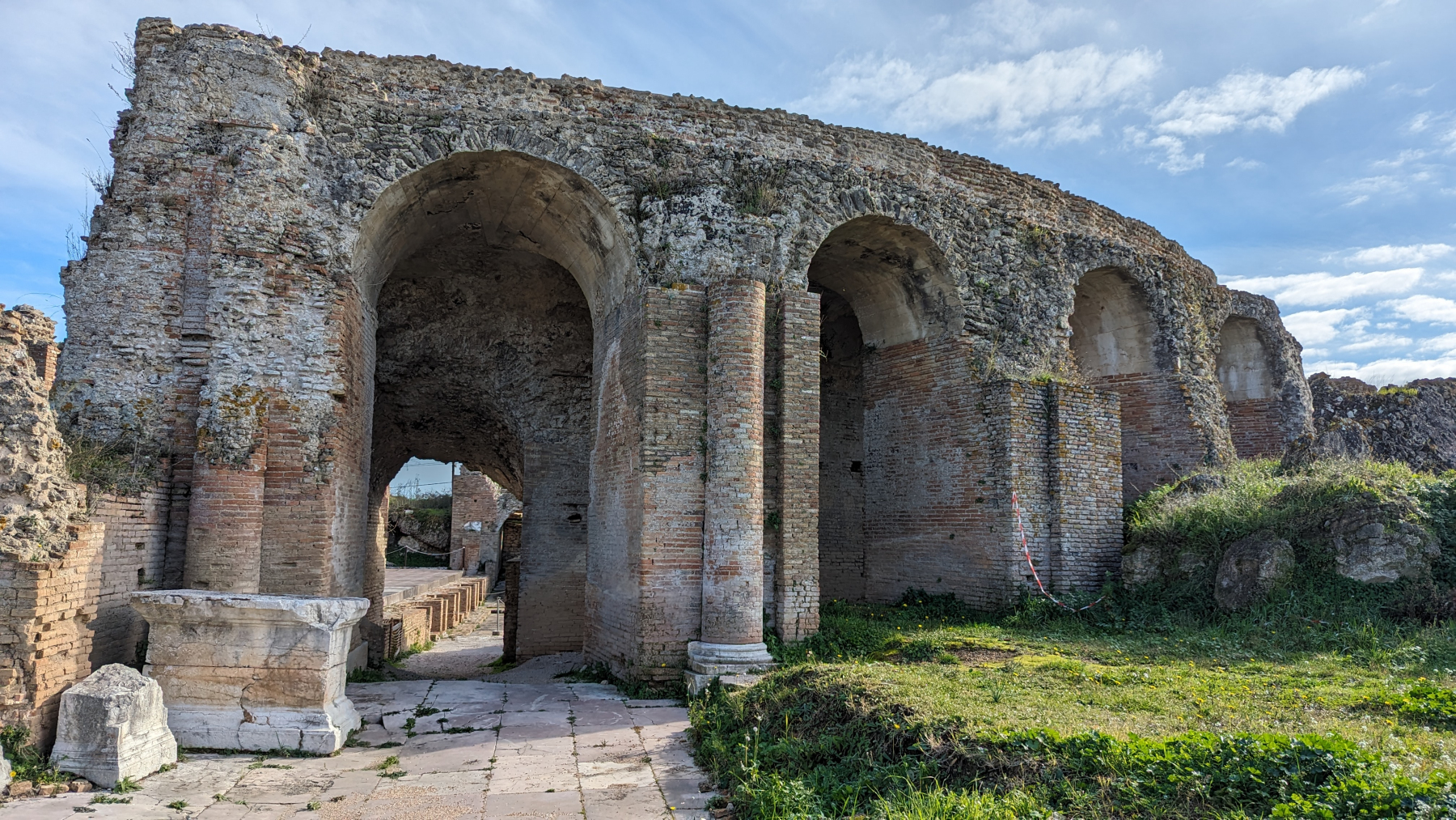 Nach einer ruhigen Nacht am Meer sehen wir, dass es in der Nähe noch eine uns unbekannte antike römische Stätte liegt – Nikopolis. 31 v.Chr. von Kaiser Augustus gegründet. Auf dem sehr weitläufigen Gelände, welches nur mit dem Fahrzeug zu besuchen ist, verteilen sich u.a. zwei Theater, eine lange Stadtmauer und auch Mosaike. Wir bezahlen € 4,–/p.P. Eintritt und sind insgesamt ganz angetan, stehen aber plötzlich vor dem kleinen renovierten Odeon (Theater), welches verschlossen ist. Das geht ja gar nicht 🙈. Zurück zum Auto und zumindest mal mit Drohne gucken. Nicht nur, dass es – wie gesagt – speziell über Ausgrabungen – strengstens verboten ist. Wir haben auch gelesen, dass in Griechenland Greifvögel auf Drohnen abgerichtet werden. Was schließen wir daraus: Bilder und Videos der Drohne täglich sichern, Rest macht dann die Versicherung…