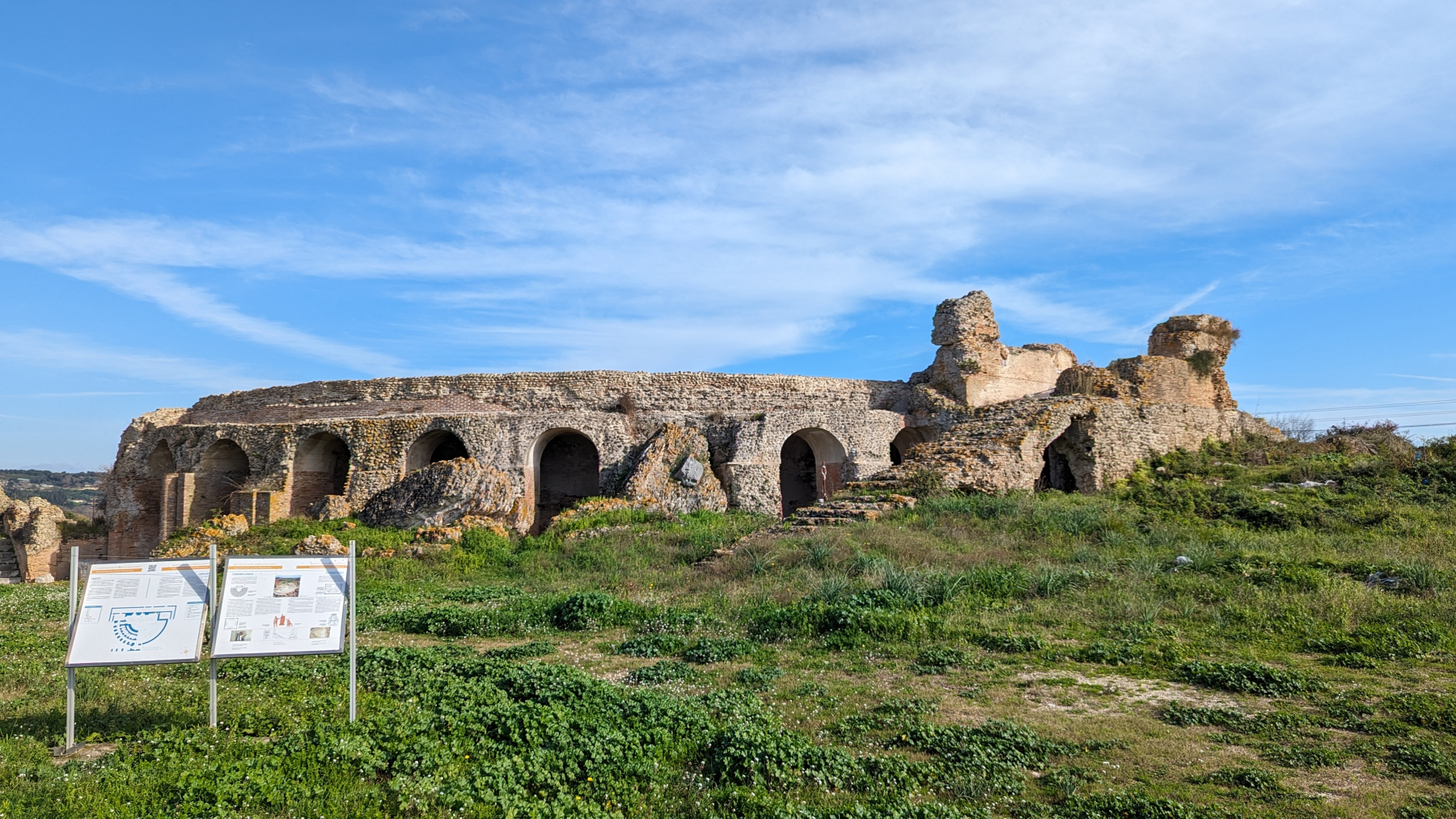 Nach einer ruhigen Nacht am Meer sehen wir, dass es in der Nähe noch eine uns unbekannte antike römische Stätte liegt – Nikopolis. 31 v.Chr. von Kaiser Augustus gegründet. Auf dem sehr weitläufigen Gelände, welches nur mit dem Fahrzeug zu besuchen ist, verteilen sich u.a. zwei Theater, eine lange Stadtmauer und auch Mosaike. Wir bezahlen € 4,–/p.P. Eintritt und sind insgesamt ganz angetan, stehen aber plötzlich vor dem kleinen renovierten Odeon (Theater), welches verschlossen ist. Das geht ja gar nicht 🙈. Zurück zum Auto und zumindest mal mit Drohne gucken. Nicht nur, dass es – wie gesagt – speziell über Ausgrabungen – strengstens verboten ist. Wir haben auch gelesen, dass in Griechenland Greifvögel auf Drohnen abgerichtet werden. Was schließen wir daraus: Bilder und Videos der Drohne täglich sichern, Rest macht dann die Versicherung…