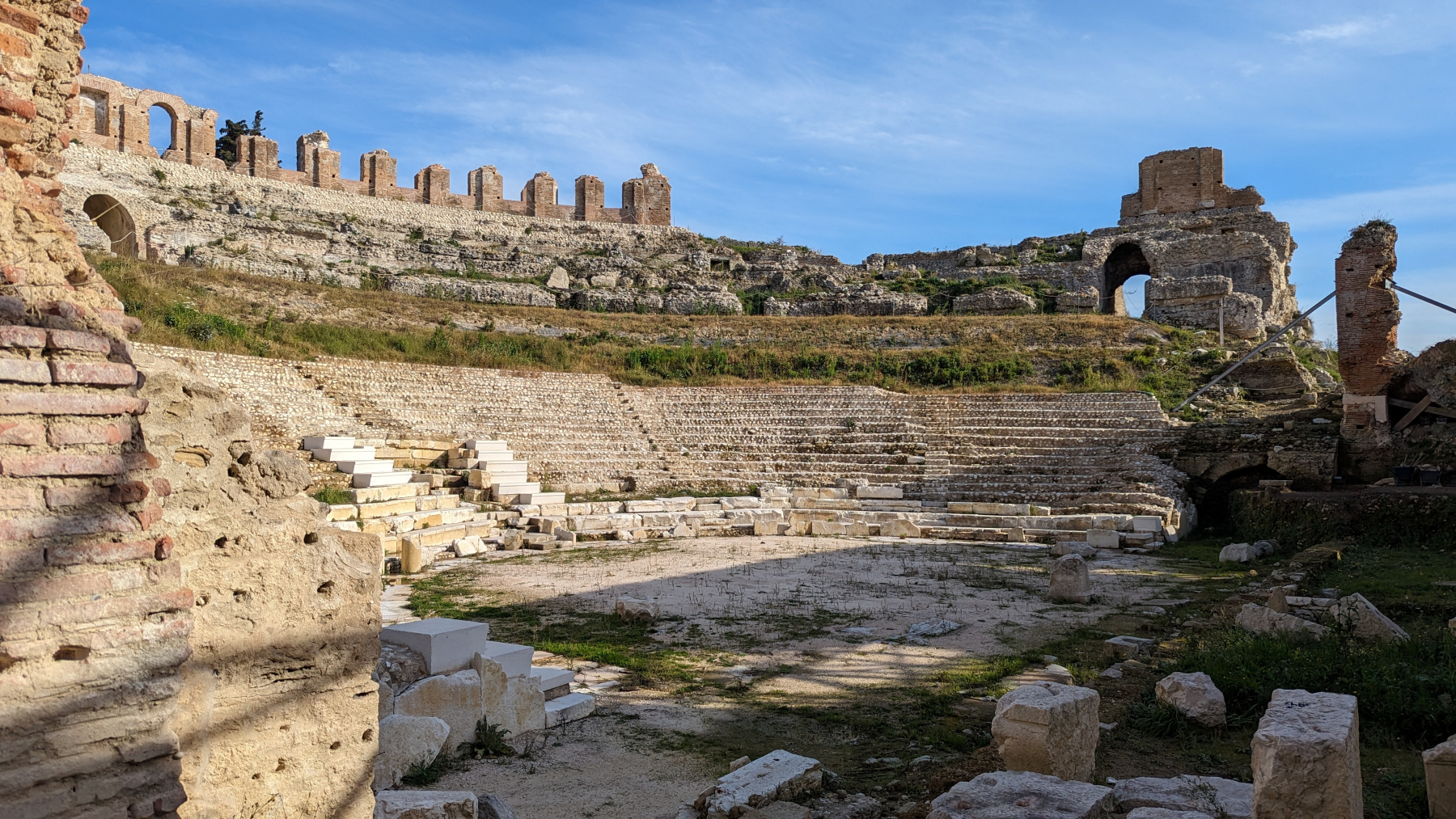Nach einer ruhigen Nacht am Meer sehen wir, dass es in der Nähe noch eine uns unbekannte antike römische Stätte liegt – Nikopolis. 31 v.Chr. von Kaiser Augustus gegründet. Auf dem sehr weitläufigen Gelände, welches nur mit dem Fahrzeug zu besuchen ist, verteilen sich u.a. zwei Theater, eine lange Stadtmauer und auch Mosaike. Wir bezahlen € 4,–/p.P. Eintritt und sind insgesamt ganz angetan, stehen aber plötzlich vor dem kleinen renovierten Odeon (Theater), welches verschlossen ist. Das geht ja gar nicht 🙈. Zurück zum Auto und zumindest mal mit Drohne gucken. Nicht nur, dass es – wie gesagt – speziell über Ausgrabungen – strengstens verboten ist. Wir haben auch gelesen, dass in Griechenland Greifvögel auf Drohnen abgerichtet werden. Was schließen wir daraus: Bilder und Videos der Drohne täglich sichern, Rest macht dann die Versicherung…