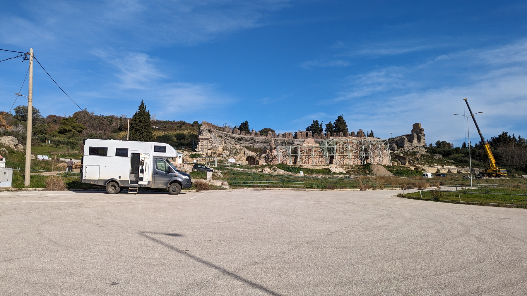 Nach einer ruhigen Nacht am Meer sehen wir, dass es in der Nähe noch eine uns unbekannte antike römische Stätte liegt – Nikopolis. 31 v.Chr. von Kaiser Augustus gegründet. Auf dem sehr weitläufigen Gelände, welches nur mit dem Fahrzeug zu besuchen ist, verteilen sich u.a. zwei Theater, eine lange Stadtmauer und auch Mosaike. Wir bezahlen € 4,–/p.P. Eintritt und sind insgesamt ganz angetan, stehen aber plötzlich vor dem kleinen renovierten Odeon (Theater), welches verschlossen ist. Das geht ja gar nicht 🙈. Zurück zum Auto und zumindest mal mit Drohne gucken. Nicht nur, dass es – wie gesagt – speziell über Ausgrabungen – strengstens verboten ist. Wir haben auch gelesen, dass in Griechenland Greifvögel auf Drohnen abgerichtet werden. Was schließen wir daraus: Bilder und Videos der Drohne täglich sichern, Rest macht dann die Versicherung…