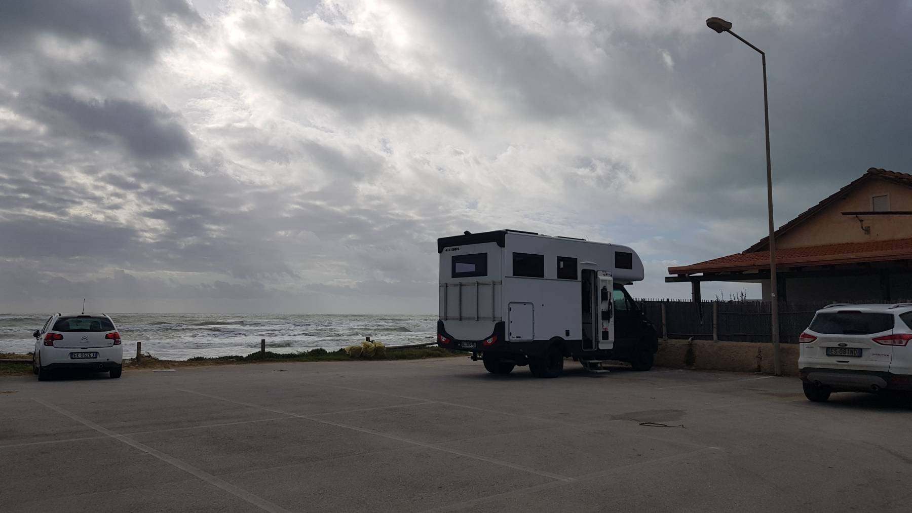 Zwei volle Tage bleiben wir dann am Strandplatz und lassen Regen und starken Wind, Regen und Wind sein. Zu Beginn stehen noch drei weitere Wohnmobile da. In den paar Sonnenstunden kommen einige Kitesurfer und grillen im Windschatten unseres zuHauses.