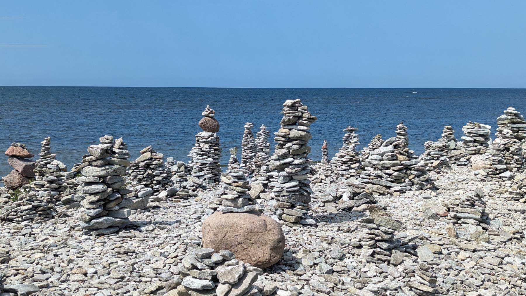 Auf Saaremaa gibt es drei Sehenswürdigkeiten, die auch von Kreuzfahrtpassagieren angefahren werden. Den Meteoritenkrater, den Mühlenberg mit historischen Bockwindmühlen und Panga Pank, mit 21 Meter, die höchsten Klippen Estlands. An den drei Orten ist es auch tatsächlich am vollsten, hauptsächlich Esten oder Finnen. Ansonsten fahren wir manchmal auch auf Straßen, wo uns eine Stunde kein Fahrzeug begegnet und kommen an sehr viele schöne Stellen vorbei.