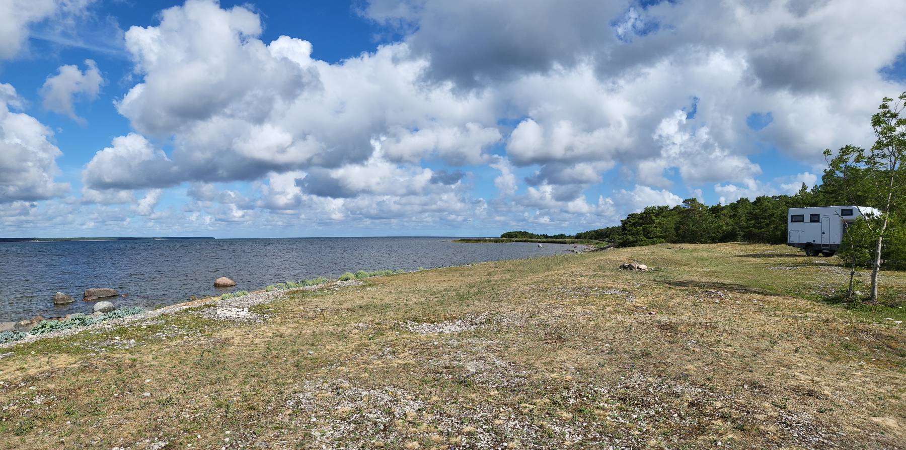 Auf Saaremaa gibt es drei Sehenswürdigkeiten, die auch von Kreuzfahrtpassagieren angefahren werden. Den Meteoritenkrater, den Mühlenberg mit historischen Bockwindmühlen und Panga Pank, mit 21 Meter, die höchsten Klippen Estlands. An den drei Orten ist es auch tatsächlich am vollsten, hauptsächlich Esten oder Finnen. Ansonsten fahren wir manchmal auch auf Straßen, wo uns eine Stunde kein Fahrzeug begegnet und kommen an sehr viele schöne Stellen vorbei.