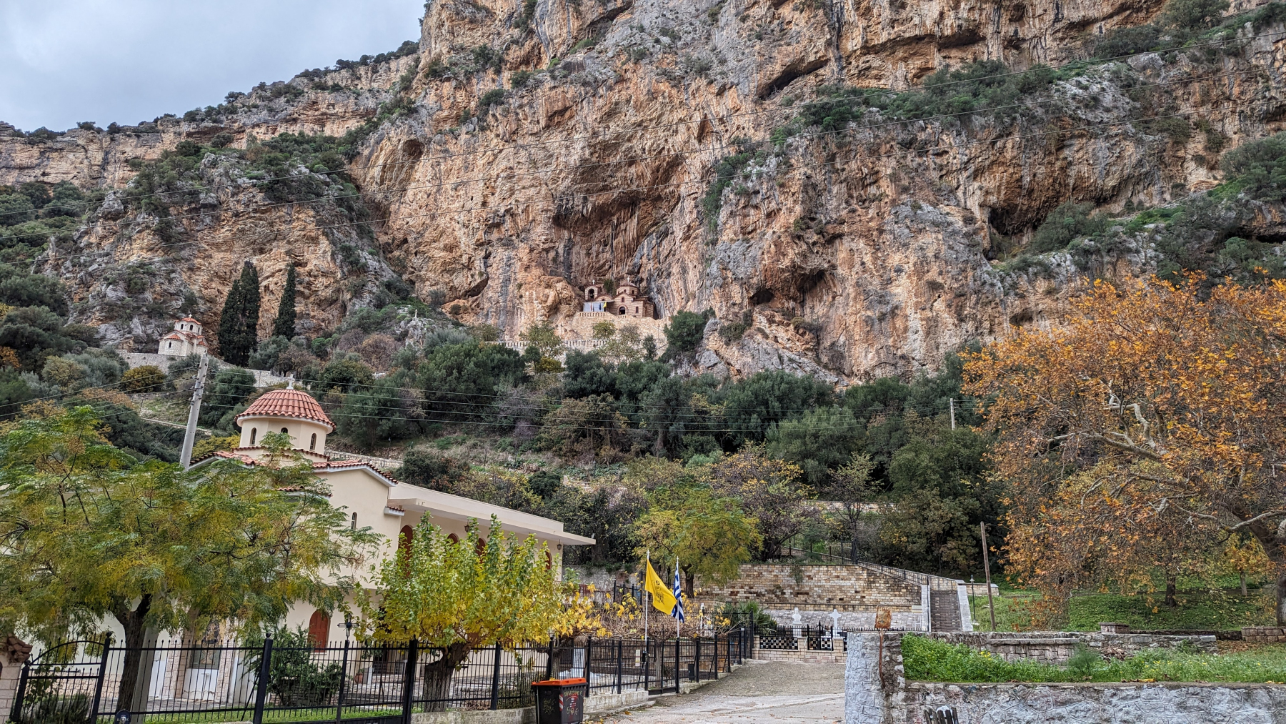 Wir befinden uns auf den Serpentinen Richtung Delphi. Plötzlich ein lauter Knall. Schnell rechts raus auf eine Aussichtsfläche. Rechts vorne ist der Reifen geplatzt. Unser dritter Platten insgesamt mit dem Fahrzeug, und das mit neuen Reifen. Der Unterschied ist dieses Mal aber offensichtlich anders. Der Reifen wurde an der Flanke angeschnitten, also Sabotage. Wir vermuten „Deutschlandhasser“, da wir als Camper immer abseits von Orten genächtigt haben und auch so keinerlei Konflikte hatten. Ärgerlich ist zudem, dass der Wagenheber dabei seinen Geist aufgibt, was sich durch auslaufendes Hydrauliköl bemerkbar macht. Glücklicherweise erst nach der Montage des Ersatzrades. Also muss ein neuer Originalheber von Mercedes her, da er in die Vorrichtung passen muss.