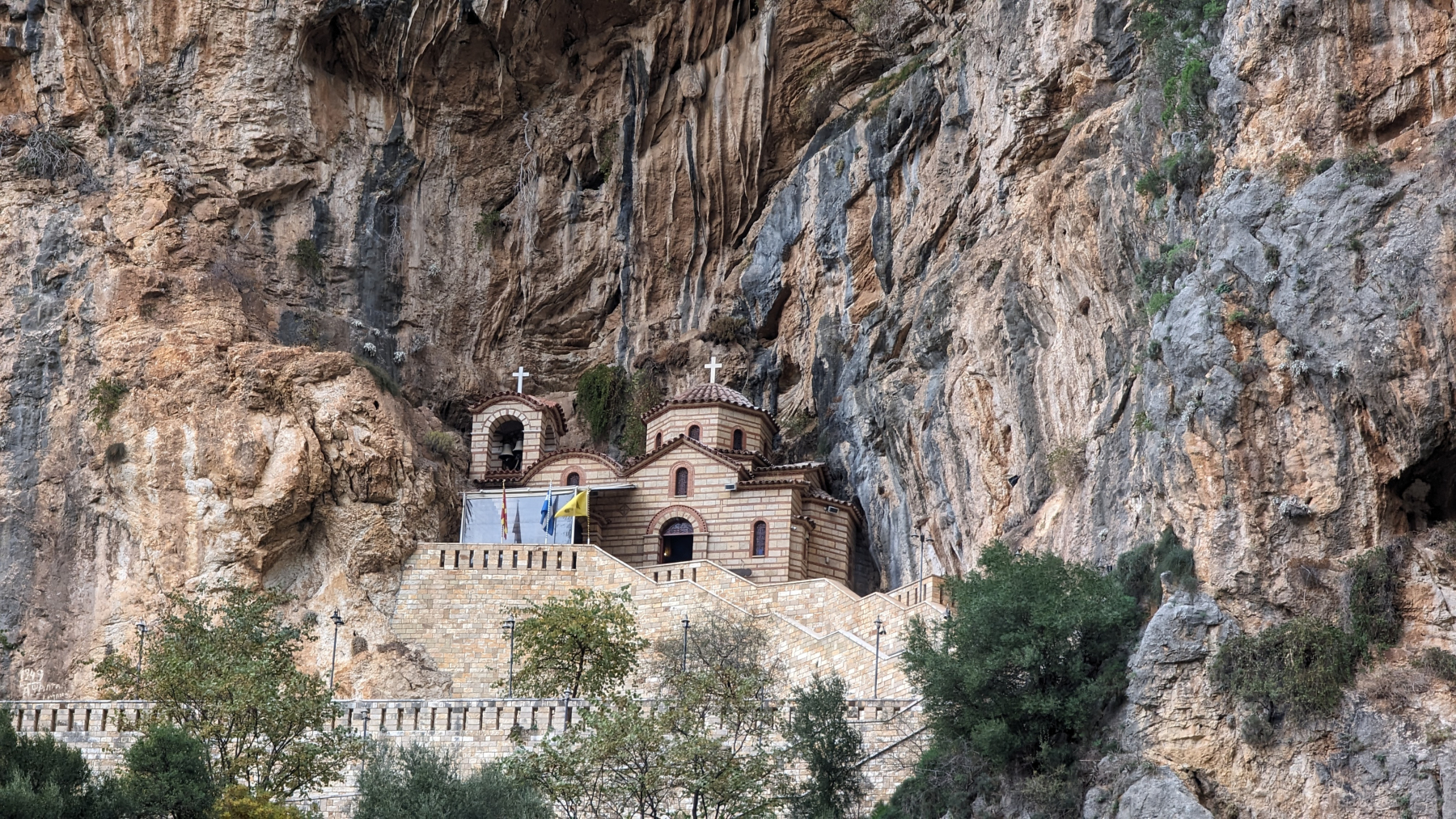 Wir befinden uns auf den Serpentinen Richtung Delphi. Plötzlich ein lauter Knall. Schnell rechts raus auf eine Aussichtsfläche. Rechts vorne ist der Reifen geplatzt. Unser dritter Platten insgesamt mit dem Fahrzeug, und das mit neuen Reifen. Der Unterschied ist dieses Mal aber offensichtlich anders. Der Reifen wurde an der Flanke angeschnitten, also Sabotage. Wir vermuten „Deutschlandhasser“, da wir als Camper immer abseits von Orten genächtigt haben und auch so keinerlei Konflikte hatten. Ärgerlich ist zudem, dass der Wagenheber dabei seinen Geist aufgibt, was sich durch auslaufendes Hydrauliköl bemerkbar macht. Glücklicherweise erst nach der Montage des Ersatzrades. Also muss ein neuer Originalheber von Mercedes her, da er in die Vorrichtung passen muss.