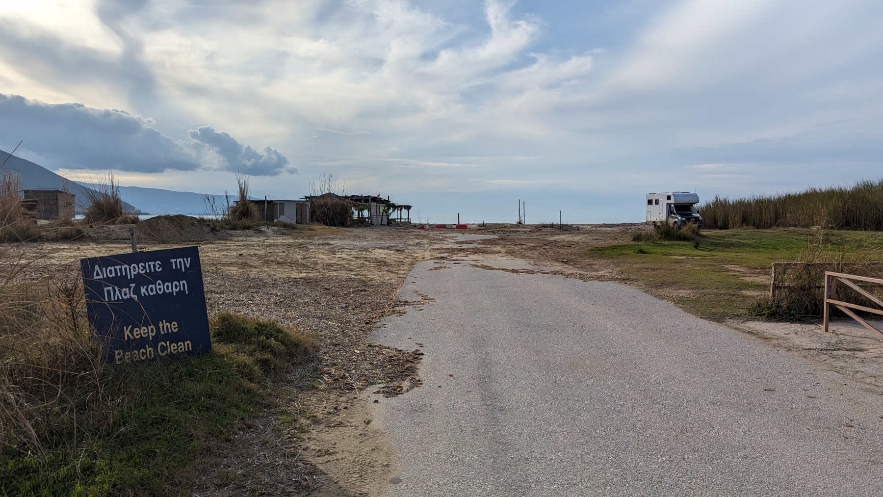 Wir befinden uns auf den Serpentinen Richtung Delphi. Plötzlich ein lauter Knall. Schnell rechts raus auf eine Aussichtsfläche. Rechts vorne ist der Reifen geplatzt. Unser dritter Platten insgesamt mit dem Fahrzeug, und das mit neuen Reifen. Der Unterschied ist dieses Mal aber offensichtlich anders. Der Reifen wurde an der Flanke angeschnitten, also Sabotage. Wir vermuten „Deutschlandhasser“, da wir als Camper immer abseits von Orten genächtigt haben und auch so keinerlei Konflikte hatten. Ärgerlich ist zudem, dass der Wagenheber dabei seinen Geist aufgibt, was sich durch auslaufendes Hydrauliköl bemerkbar macht. Glücklicherweise erst nach der Montage des Ersatzrades. Also muss ein neuer Originalheber von Mercedes her, da er in die Vorrichtung passen muss.