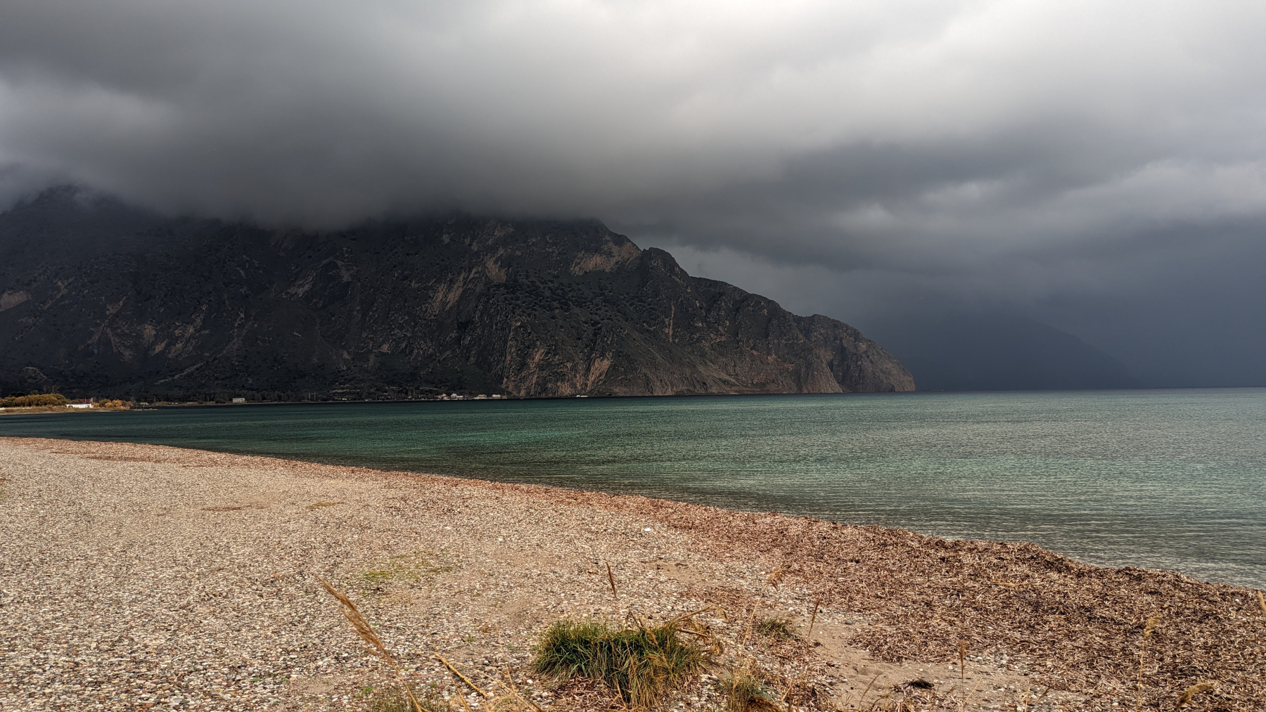 So umrunden wir die Insel weiter, machen kurze Stopps in kleinen schönen Örtchen, in denen aber alles geschlossen ist, und bleiben wieder auf einem Damm im Nordosten der Insel. Hier treffen wir mal wieder Reisende, mit einem Weltreisefahrzeug auf LKW-Basis aus Österreich. Drei Jahre haben sie vor Richtung Asien durch Iran und Kasachstan zu tingeln. Jünger als wir. Woher nehmen die alle die Zeit und das Geld??? Da sie auch auf der Peleponnes überwintern wollen, werden wir sie mal fragen…