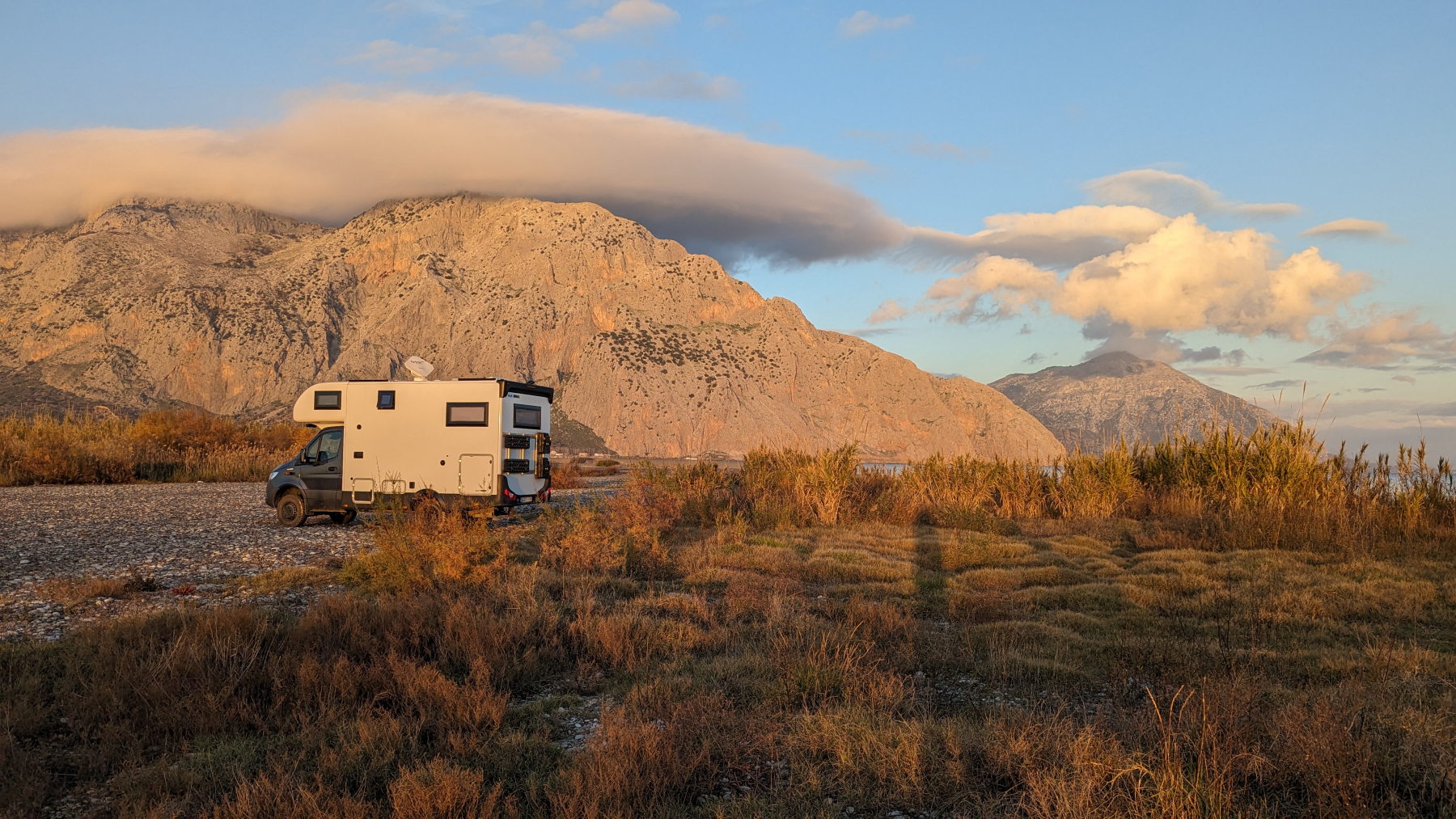 So umrunden wir die Insel weiter, machen kurze Stopps in kleinen schönen Örtchen, in denen aber alles geschlossen ist, und bleiben wieder auf einem Damm im Nordosten der Insel. Hier treffen wir mal wieder Reisende, mit einem Weltreisefahrzeug auf LKW-Basis aus Österreich. Drei Jahre haben sie vor Richtung Asien durch Iran und Kasachstan zu tingeln. Jünger als wir. Woher nehmen die alle die Zeit und das Geld??? Da sie auch auf der Peleponnes überwintern wollen, werden wir sie mal fragen…
