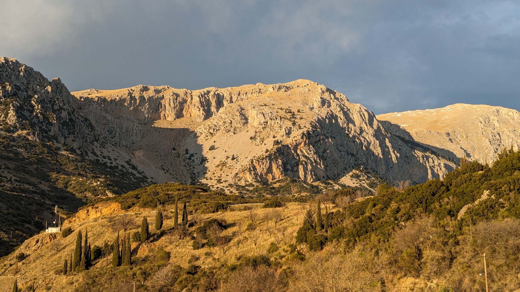 Wir befinden uns auf den Serpentinen Richtung Delphi. Plötzlich ein lauter Knall. Schnell rechts raus auf eine Aussichtsfläche. Rechts vorne ist der Reifen geplatzt. Unser dritter Platten insgesamt mit dem Fahrzeug, und das mit neuen Reifen. Der Unterschied ist dieses Mal aber offensichtlich anders. Der Reifen wurde an der Flanke angeschnitten, also Sabotage. Wir vermuten „Deutschlandhasser“, da wir als Camper immer abseits von Orten genächtigt haben und auch so keinerlei Konflikte hatten. Ärgerlich ist zudem, dass der Wagenheber dabei seinen Geist aufgibt, was sich durch auslaufendes Hydrauliköl bemerkbar macht. Glücklicherweise erst nach der Montage des Ersatzrades. Also muss ein neuer Originalheber von Mercedes her, da er in die Vorrichtung passen muss.