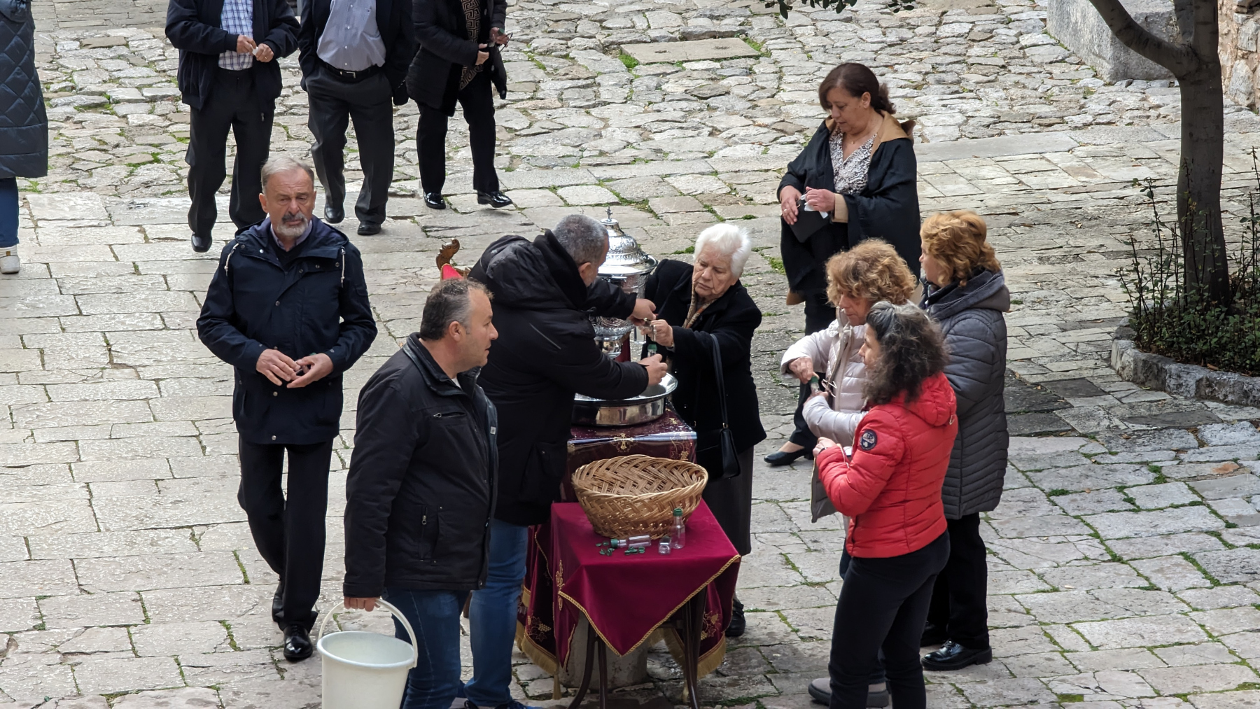 Wir befinden uns auf den Serpentinen Richtung Delphi. Plötzlich ein lauter Knall. Schnell rechts raus auf eine Aussichtsfläche. Rechts vorne ist der Reifen geplatzt. Unser dritter Platten insgesamt mit dem Fahrzeug, und das mit neuen Reifen. Der Unterschied ist dieses Mal aber offensichtlich anders. Der Reifen wurde an der Flanke angeschnitten, also Sabotage. Wir vermuten „Deutschlandhasser“, da wir als Camper immer abseits von Orten genächtigt haben und auch so keinerlei Konflikte hatten. Ärgerlich ist zudem, dass der Wagenheber dabei seinen Geist aufgibt, was sich durch auslaufendes Hydrauliköl bemerkbar macht. Glücklicherweise erst nach der Montage des Ersatzrades. Also muss ein neuer Originalheber von Mercedes her, da er in die Vorrichtung passen muss.