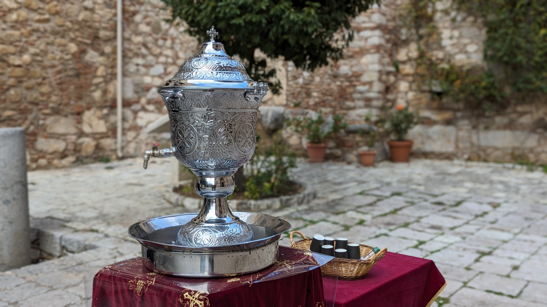 Wir befinden uns auf den Serpentinen Richtung Delphi. Plötzlich ein lauter Knall. Schnell rechts raus auf eine Aussichtsfläche. Rechts vorne ist der Reifen geplatzt. Unser dritter Platten insgesamt mit dem Fahrzeug, und das mit neuen Reifen. Der Unterschied ist dieses Mal aber offensichtlich anders. Der Reifen wurde an der Flanke angeschnitten, also Sabotage. Wir vermuten „Deutschlandhasser“, da wir als Camper immer abseits von Orten genächtigt haben und auch so keinerlei Konflikte hatten. Ärgerlich ist zudem, dass der Wagenheber dabei seinen Geist aufgibt, was sich durch auslaufendes Hydrauliköl bemerkbar macht. Glücklicherweise erst nach der Montage des Ersatzrades. Also muss ein neuer Originalheber von Mercedes her, da er in die Vorrichtung passen muss.