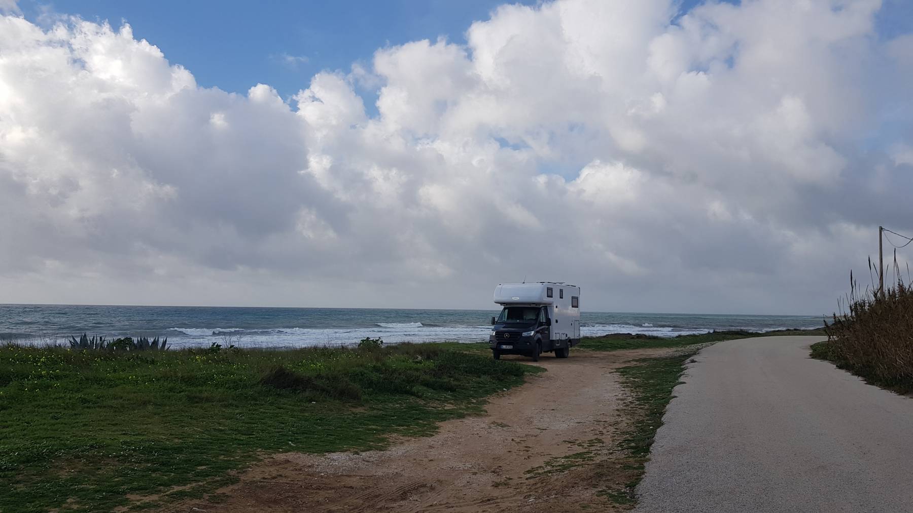 Jetzt suchen wir einen ruhigen Platz für die Feiertage. Auf dem Weg dorthin halten wir kurz, nur ein Foto von den Müllbergen an der Straße, fürs Fotoalbum. Da kommt ein dunkelhäutiger Mann und ruft uns zu: „No Photos!“. Ohje, es ist ein Flüchtlingscamp – also kein offizielles -, sah zunächst so aus wie fast überall auf Sizilien, nur etwas schlimmer. Wir entschuldigen uns und fahren zu einem Platz am Leuchtturm ein paar Kilometer weiter.