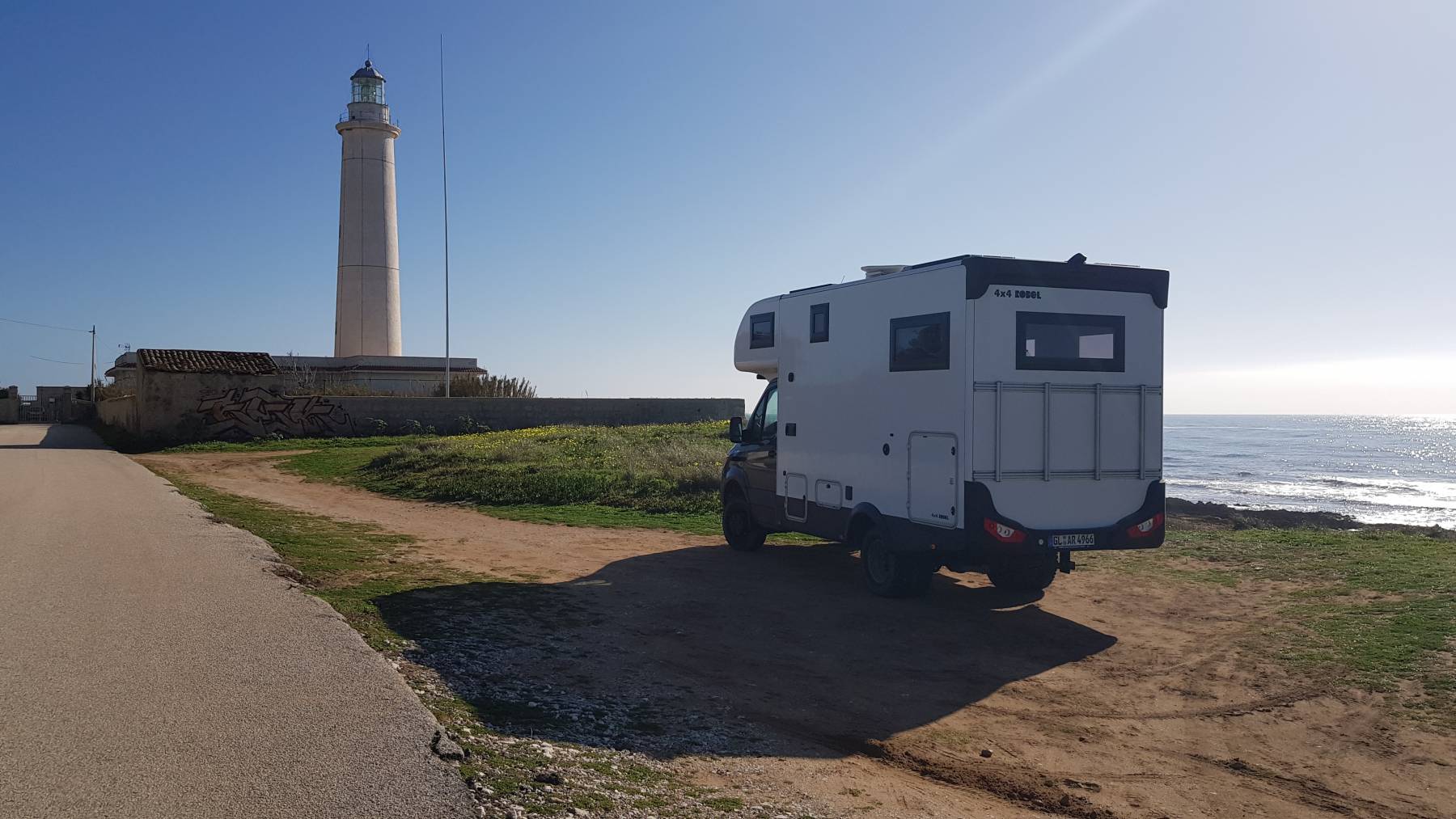 Jetzt suchen wir einen ruhigen Platz für die Feiertage. Auf dem Weg dorthin halten wir kurz, nur ein Foto von den Müllbergen an der Straße, fürs Fotoalbum. Da kommt ein dunkelhäutiger Mann und ruft uns zu: „No Photos!“. Ohje, es ist ein Flüchtlingscamp – also kein offizielles -, sah zunächst so aus wie fast überall auf Sizilien, nur etwas schlimmer. Wir entschuldigen uns und fahren zu einem Platz am Leuchtturm ein paar Kilometer weiter.