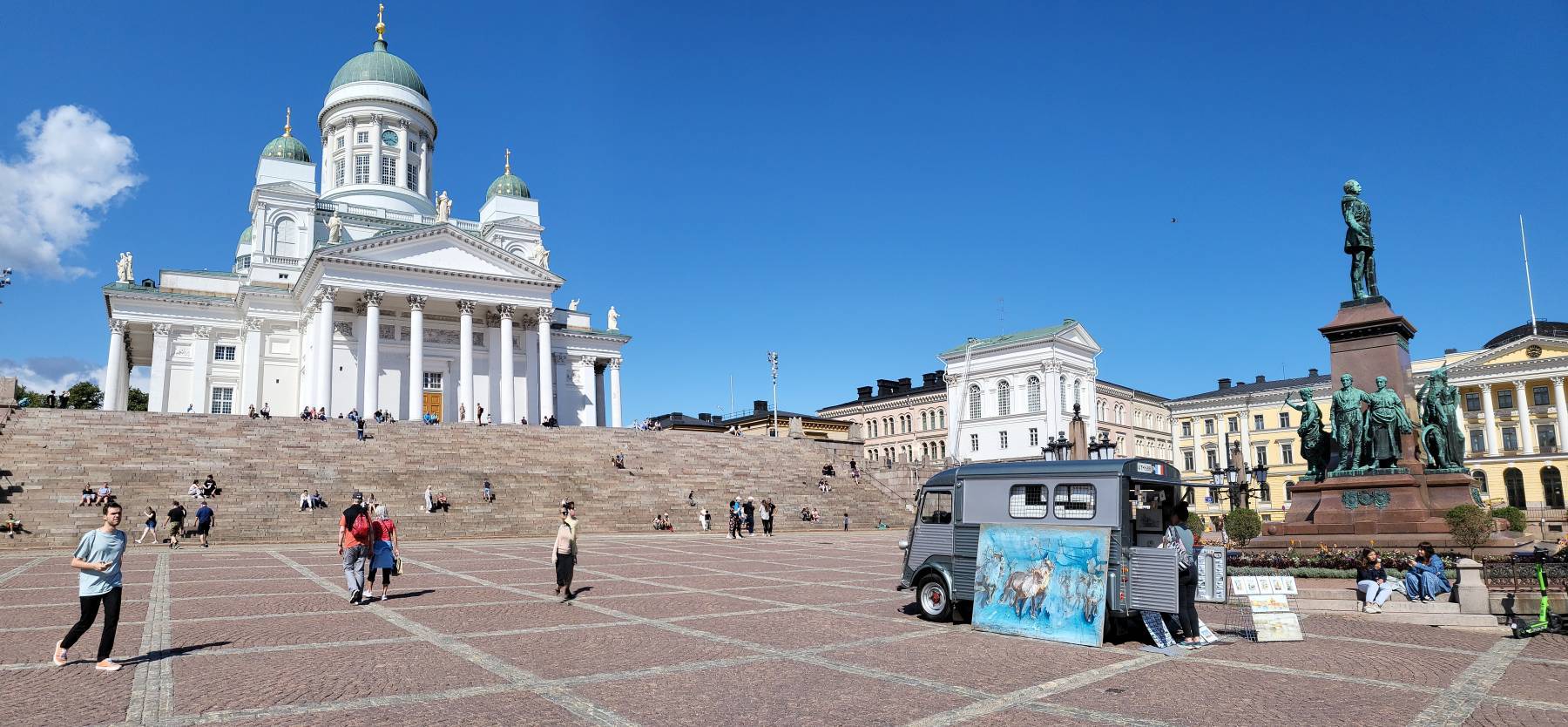 Wir kommen bereits mittags in Helsinki an. Während der Überfahrt überlegen wir, ob wir Lust auf einen weiteren Stadtspaziergang haben. Wir waren ja schon mal da – 1993. So suchen wir uns dann doch einen kostenlosen Parkplatz unweit des Zentrums. Nach den drei baltischen Hauptstädten fällt uns direkt eine Vokabel zur Abgrenzung ein: weltstädtisch. Breit angelegte Straßen, moderne Architektur und mächtige Bauten. Helsinki ist sehr voll und sehr teuer. Nach 10 km sind wir auf der Suche nach etwas zu „Beißen“. In einem kleinen, einfachen Lokal gucken wir auf die Karte: Pizza Margherita € 17,– – Nein. Also auf dem Markt zu einem Crêpes-Stand: Crêpe mit Nutella € 10,–. Vielleicht doch etwas Gesundes!? Eine kleine Schale, 250g, Erdbeeren für € 8,–. Wir haben uns entschieden: Spaghetti mit Tomatensoße im Womo.