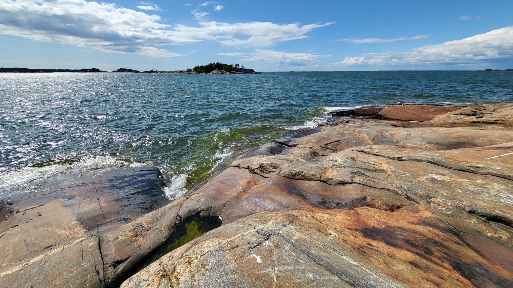 Wir waren noch nie an der finnischen Küste. So lernen wir die sehr schöne Schärenküste kennen. Man erwartet in Finnland Einsamkeit und Mücken. Beides finden wir nicht. Das zweite ist soweit ja gut. Aber von der Vollheit der Südküste sind wir doch sehr überrascht. Die fast ausnahmslos finnischen Fahrzeuge suchen hier weniger Sandstrände, hier ist halt alles steinig oder schilfig, sie wollen zuvorderst zu ihren Hütten und Booten.