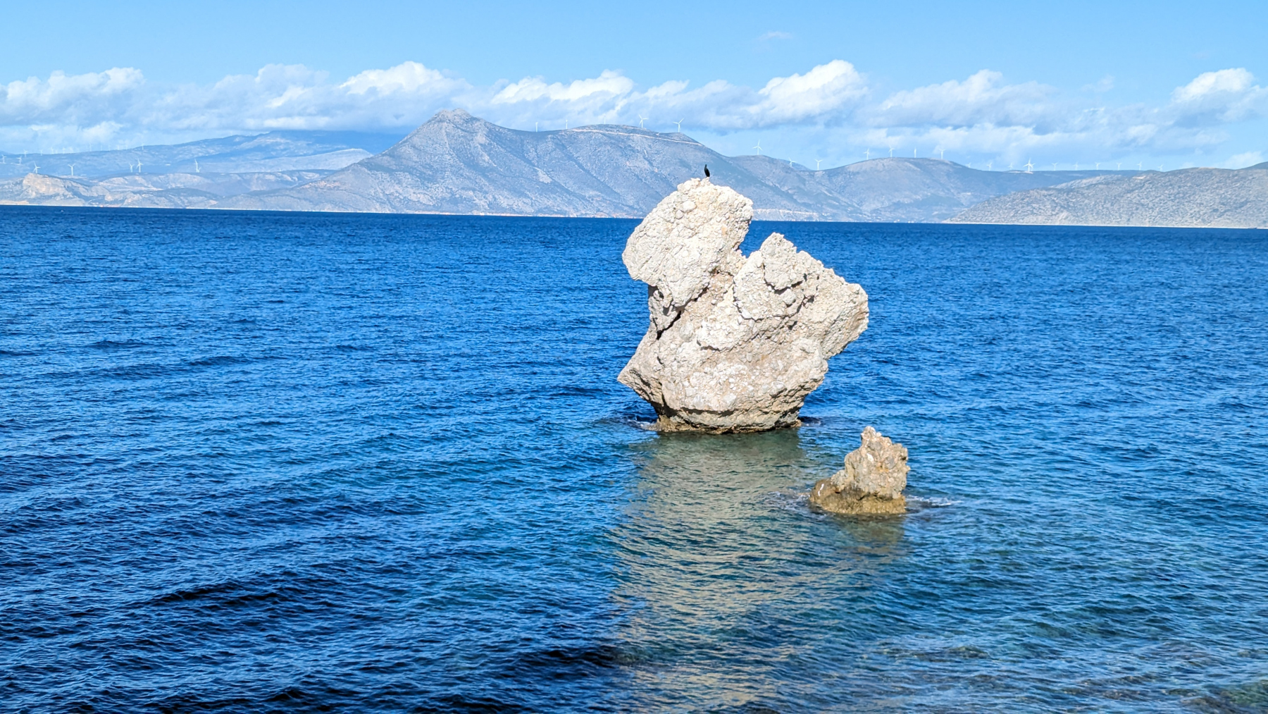 Vereinzelt haben wir ein paar Reisende getroffen. Gegenüber der Insel Poros, in Galatas, stehen jetzt direkt 6 Fahrzeuge. Eine stürmische Nacht bringen wir hinter uns und finden auf der westlichen Seite des Daumens eine weite Bucht bei der Franchthi Höhle. Eine beeindruckende Höhle aus prähistorischer Zeit.