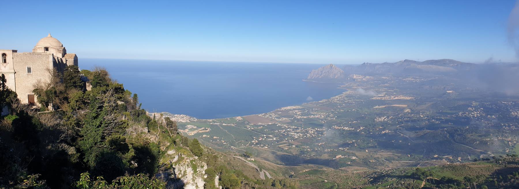 Die große Wanderung um den Berg Monte Cofano können wir uns abschminken, gesperrt wegen Steinschlag. Ein ausgewiesener, in der Nebensaison kostenloser, Parkplatz für Wohnmobile mit Blick auf die Bucht zwischen den beiden Hügeln von Erice und Monte Cofano ist unsere Wahl für wohl ein paar Tage.