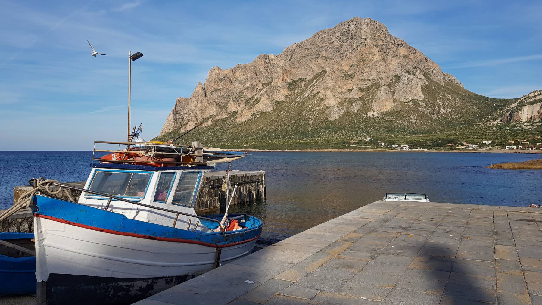Die große Wanderung um den Berg Monte Cofano können wir uns abschminken, gesperrt wegen Steinschlag. Ein ausgewiesener, in der Nebensaison kostenloser, Parkplatz für Wohnmobile mit Blick auf die Bucht zwischen den beiden Hügeln von Erice und Monte Cofano ist unsere Wahl für wohl ein paar Tage.