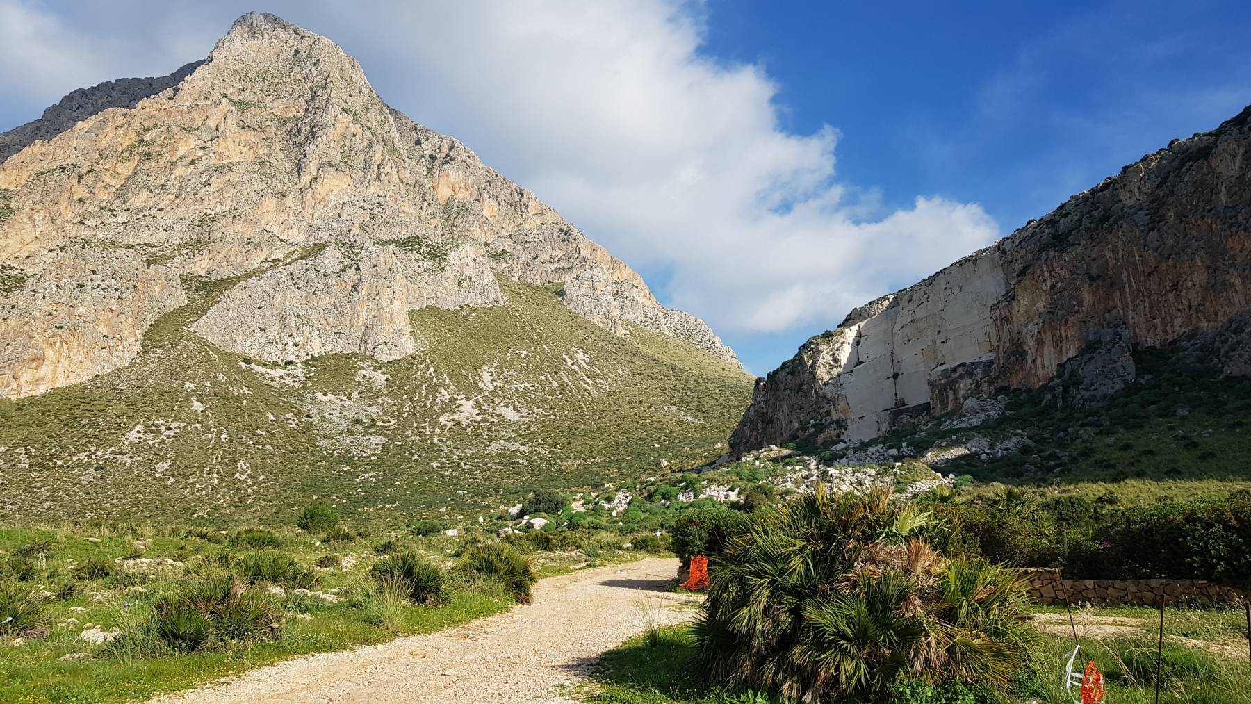 Die große Wanderung um den Berg Monte Cofano können wir uns abschminken, gesperrt wegen Steinschlag. Ein ausgewiesener, in der Nebensaison kostenloser, Parkplatz für Wohnmobile mit Blick auf die Bucht zwischen den beiden Hügeln von Erice und Monte Cofano ist unsere Wahl für wohl ein paar Tage.
