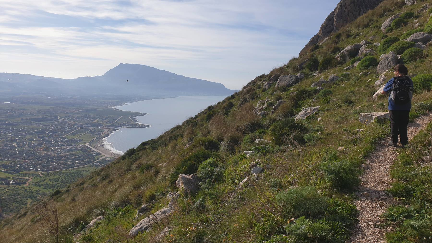 Die große Wanderung um den Berg Monte Cofano können wir uns abschminken, gesperrt wegen Steinschlag. Ein ausgewiesener, in der Nebensaison kostenloser, Parkplatz für Wohnmobile mit Blick auf die Bucht zwischen den beiden Hügeln von Erice und Monte Cofano ist unsere Wahl für wohl ein paar Tage.